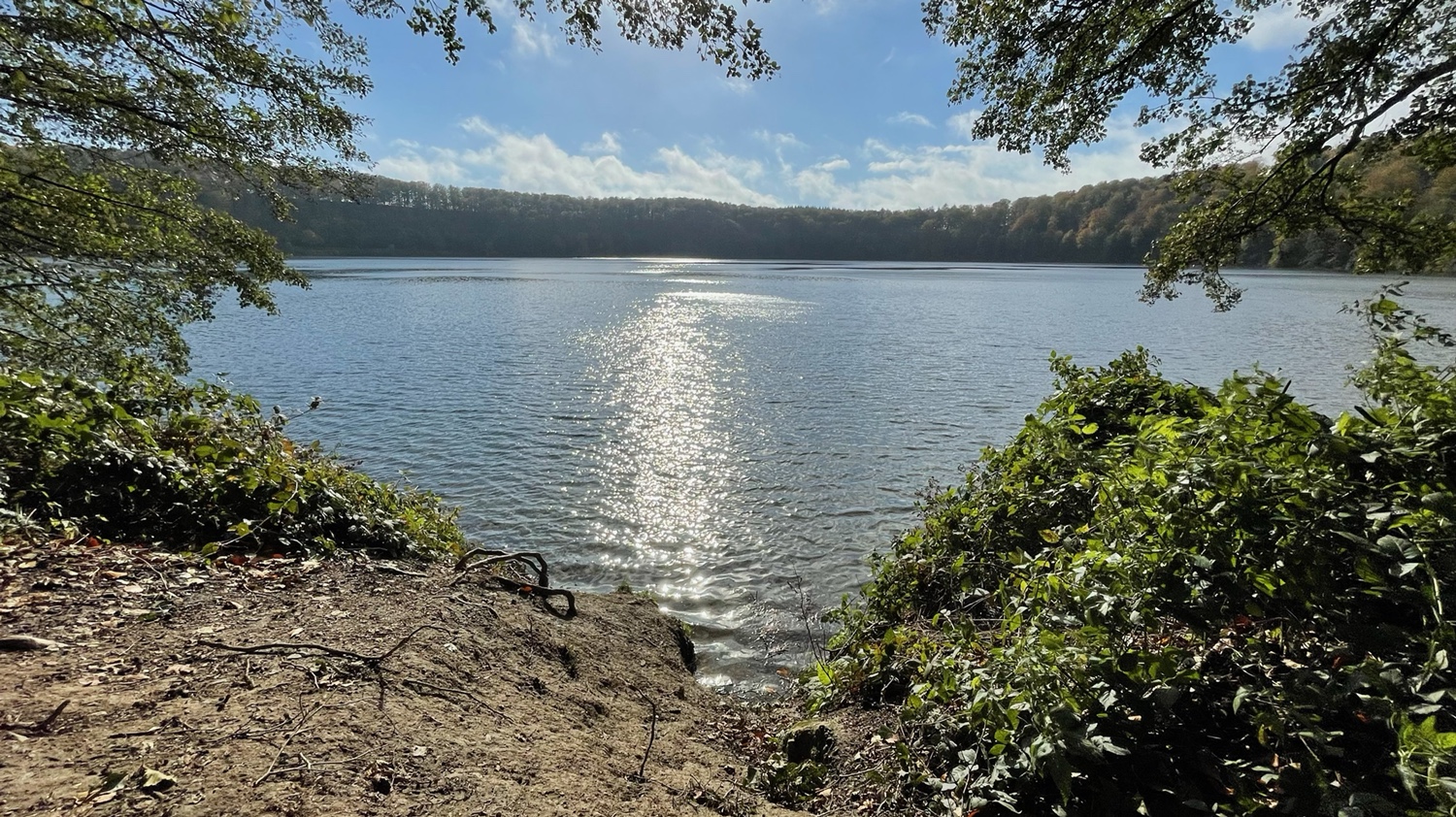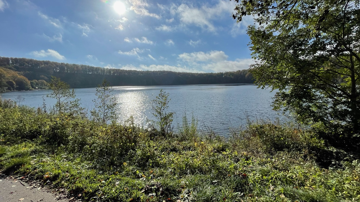 Dann sind wir in der Vulkaneifel angekommen. Und auf einen Vulkan draufgefahren. Vulkane sind Drachen. Die können Feuer spucken. Jawoll! So ist das. Die Bella kennt sich aus. Aber der Vulkan spuckt kein Feuer. Der war ganz traurig und ist voll Wasser geweint. Ganz klares Wasser. Der Vulkan heißt Pulvermaar. Das ist ein komischer Name.