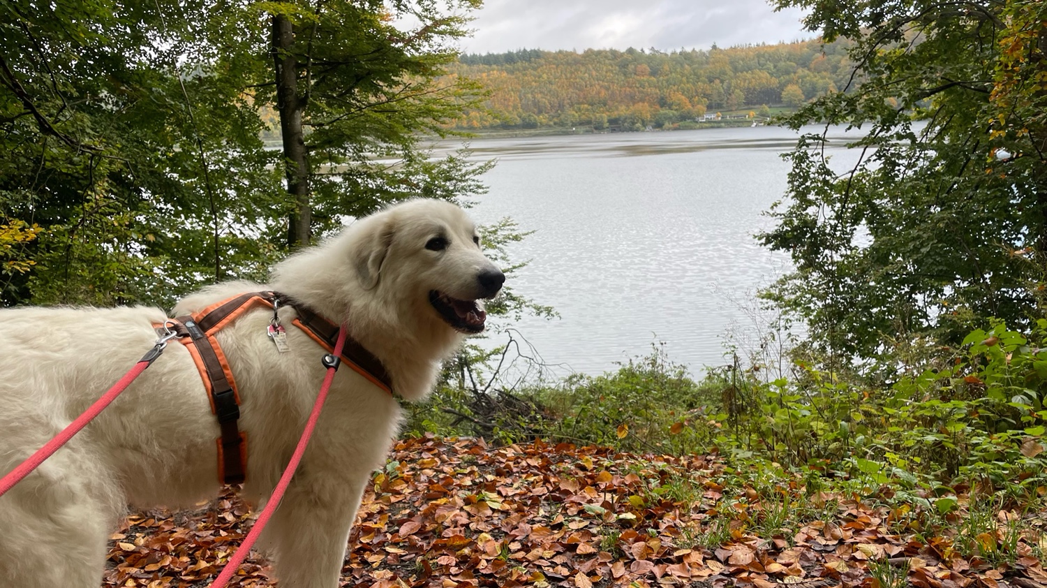 Wir sind dann eine ganze Runde um den großen Wasservulkan gewandert. Da konnte ich wieder viel schnuffeln. Und es war ein ganz schöner breiter Wanderweg. Nur direkt an das Wasser konnte ich nicht ran. Aber man konnte immer mal schön über den großen See guggen.
