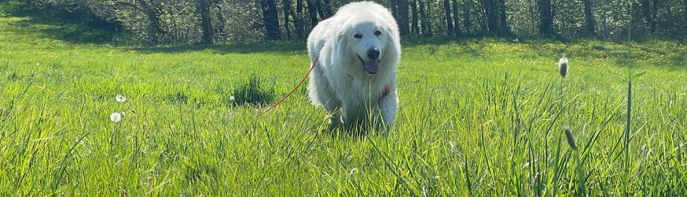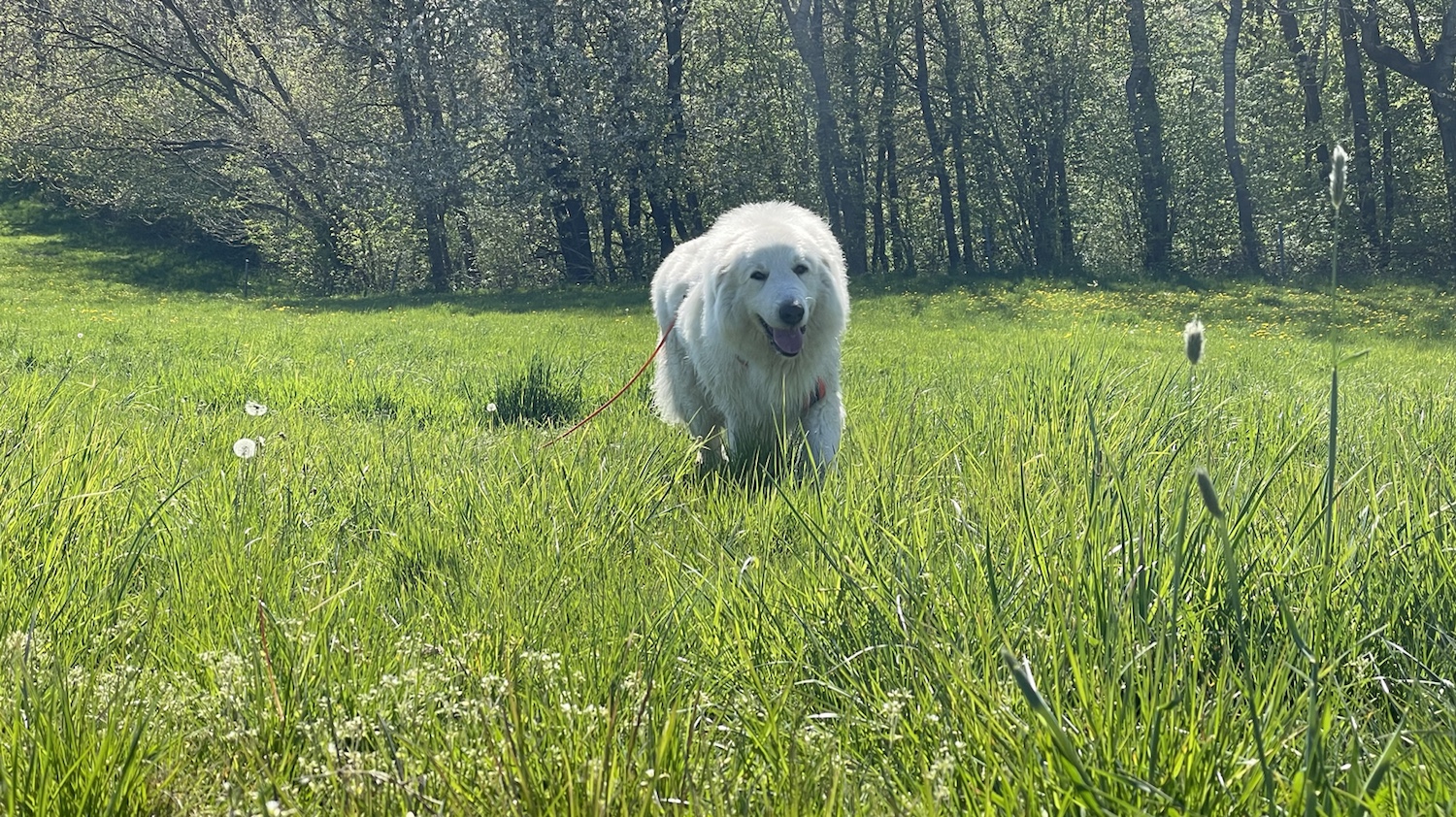 Über die Wiese am Waldrand sind wir dann zur großen Wiese gelaufen. Ich durfte im Freilauf durch das Gras schnuffeln. Die Rehe habe ich heute nicht getroffen.