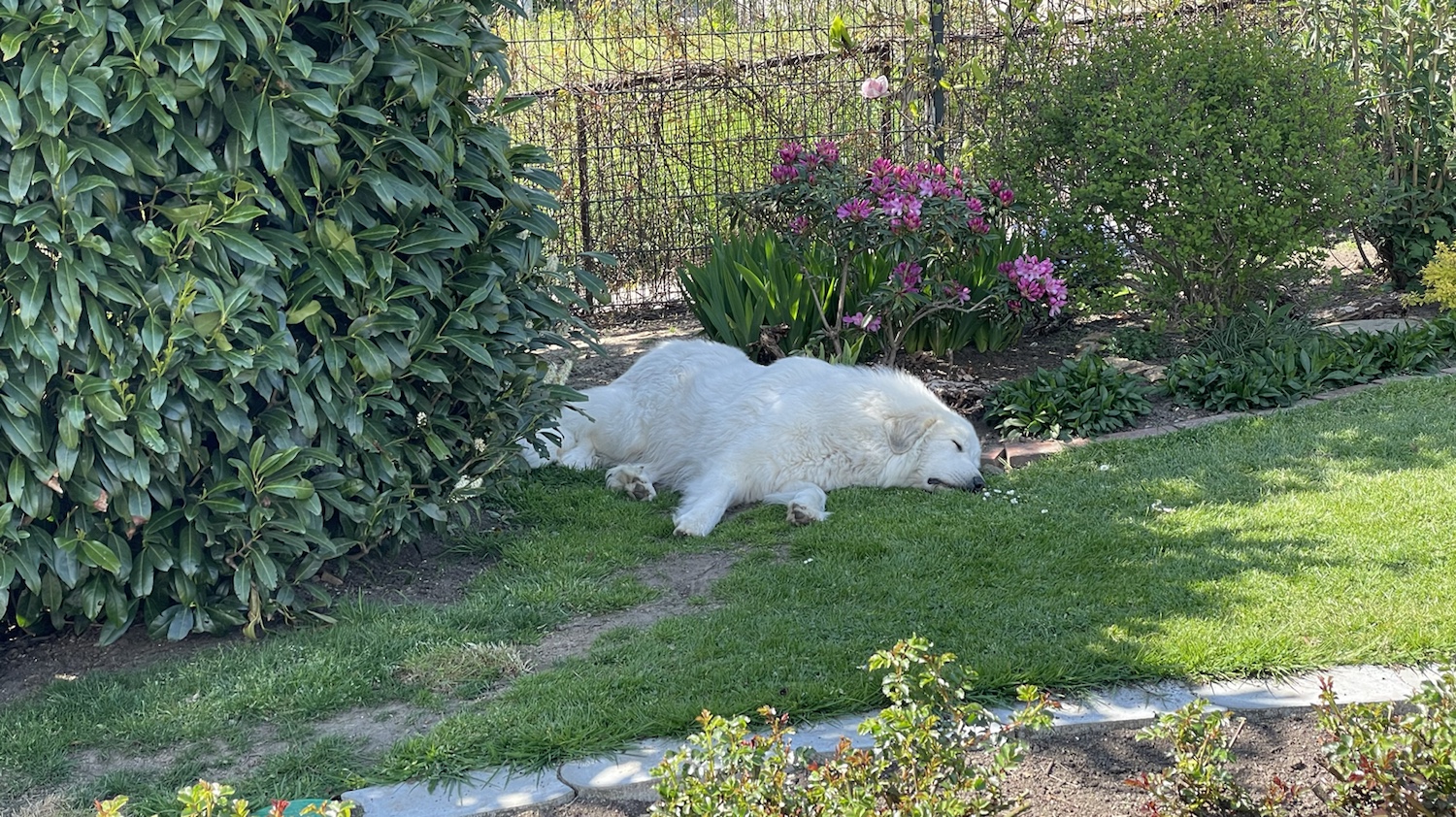 Dann sind wir über meine große Feldwiese und die Wiese auf der anderen Seite der großen Straße wieder nach Hause gegangen. Da habe ich nachmittags dann auch meinen Pyriprinzessinnenschönheitsschlaf gemacht. Und mit meinem Menschenopi bin ich in meinem Garten gewesen.