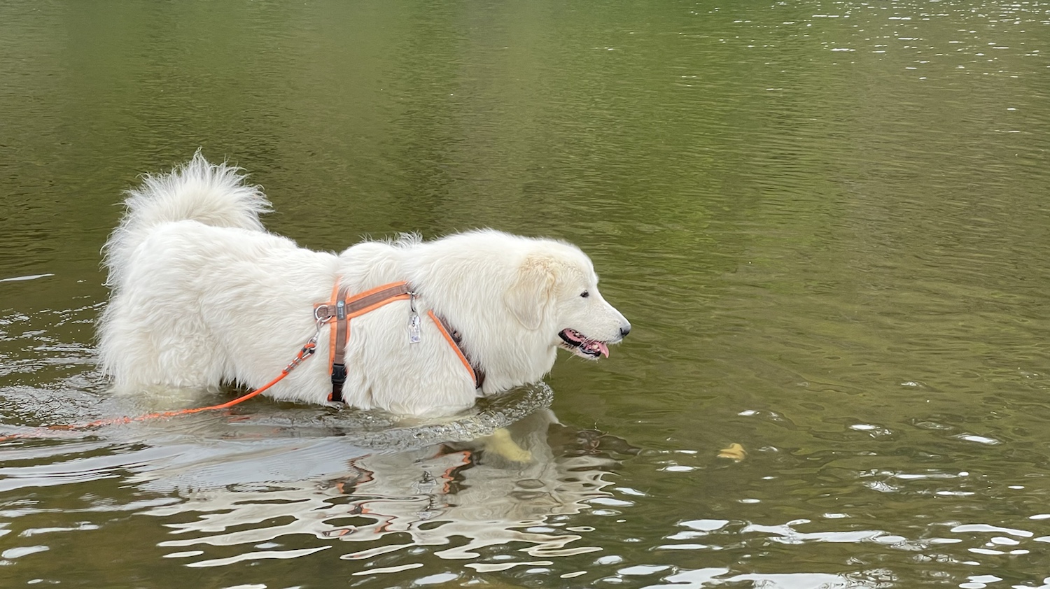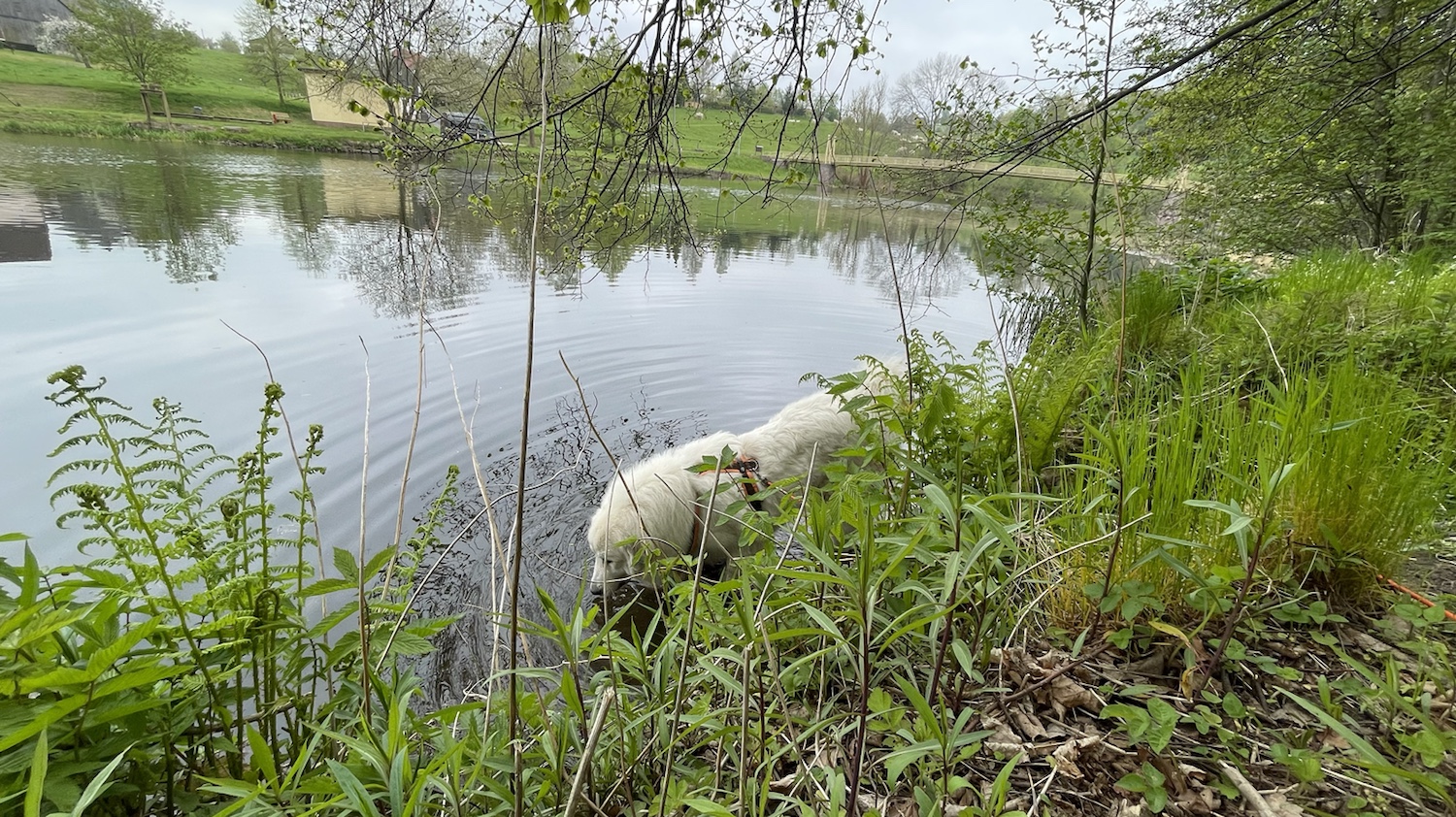Ich bin dann mit meinem großen Mensch über die Wackelbrücke und nach rechts immer am großen Fluß mit dem komischen Namen entlang. Da war ich auch mal kurz drin und hatte dann ganz schmutzige Pfötchen.