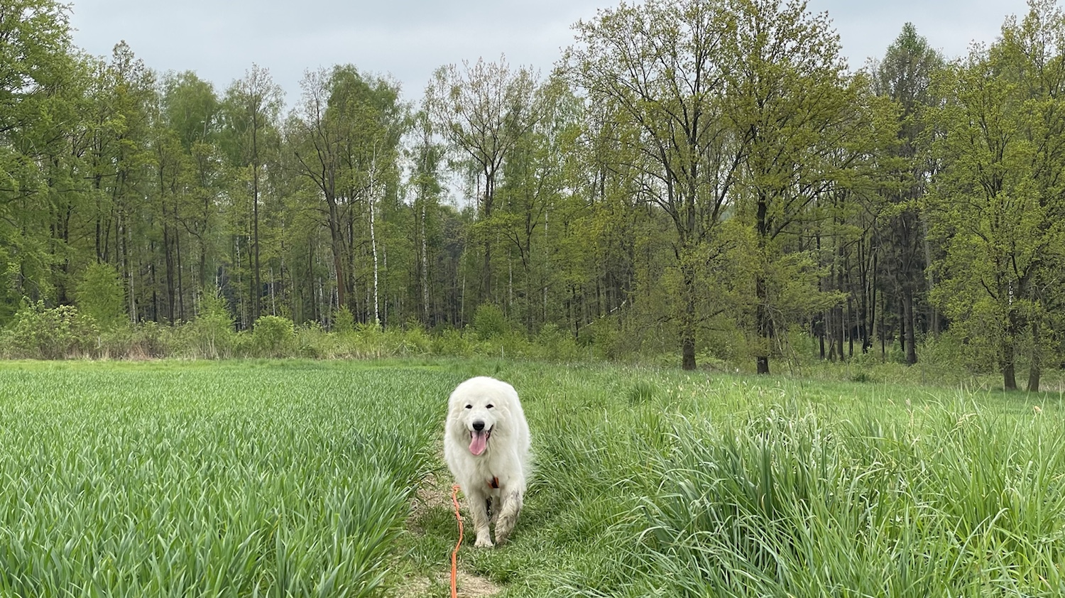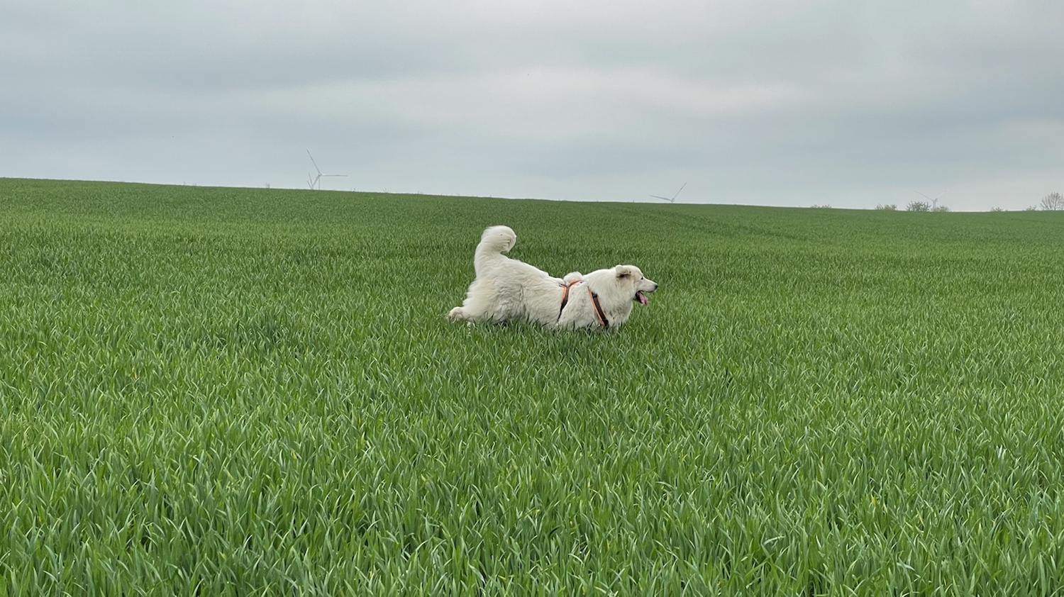 Wir sind dann zu einem großen Feld gekommen und da durfte ich dan rumflitzen. Ganz ohne Leine an mir dran. Aber ich bin immer in der Nähe von meinem großen Mensch geblieben, weiiil, ich bin eine Herdenschutzhündin, ich muß aufpassen.