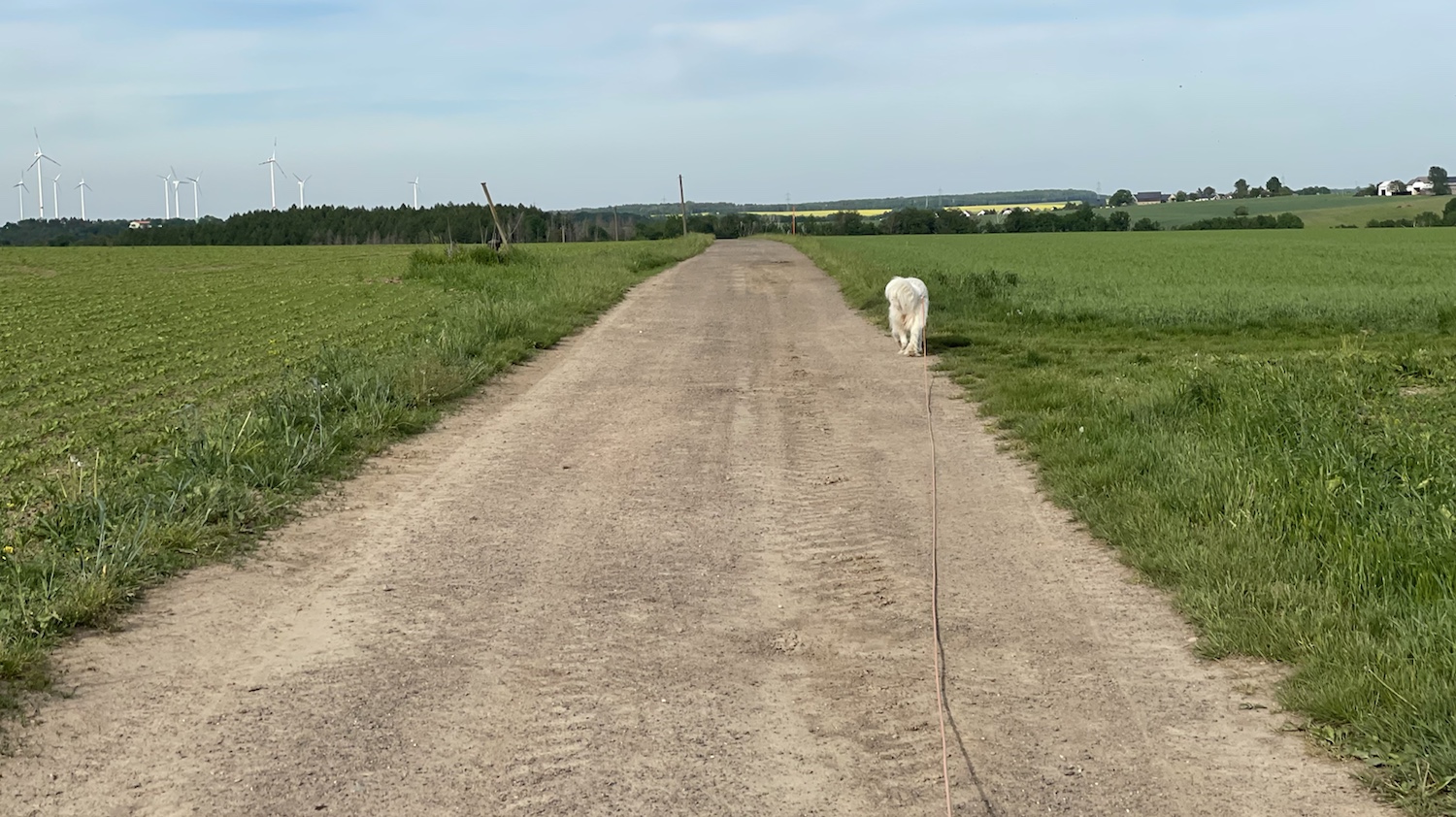 Dann war es soweit. Abendspaziergang! Mit meinem großen Mensch. Wir sind zusammen zum großen Feldweg und vorbei an meiner großen Feldwiese nach Kockisch gelaufen. Ich habe geführt. Ich bin eine Pyri!