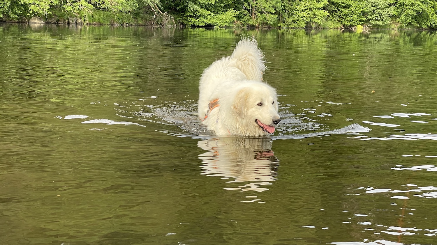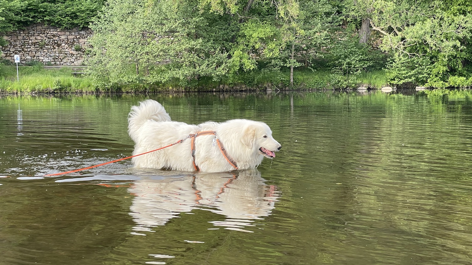 Dann ging es weiter zur Tschooo-Pauuu. Da waren zwei kleine Hunde mit ihren Menschen. Und die haben mich angeschimpft. Die kleinen Hunde, nicht die Menschen. Ich habe zurückgeschimpft. Aber mein großer Mensch hat mich festgehalten. Darum konnte ich nicht hin und kämpfen. Deshalb bin ich lieber baden gegangen. Im großen Fluß mit dem komischen Namen.