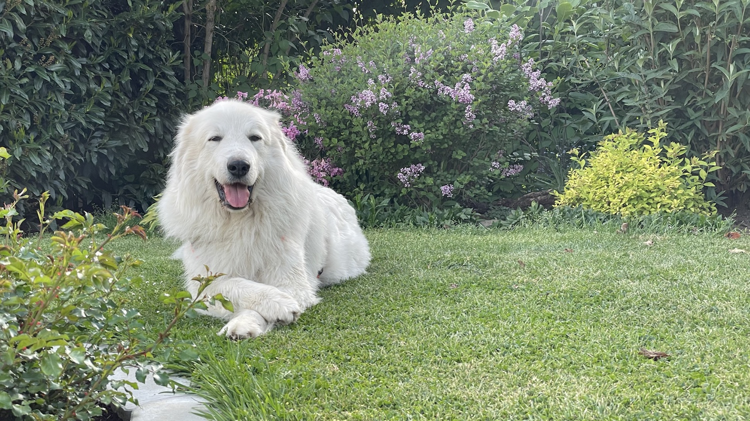 Später sind wir zusammen zu Menschenomi und Menschenopi auf die Terrasse gegangen. Da haben wir auch gekuschelt. Und Abendfutter gab es auch. Habe aber nichts gefuttert. Dafür habe ich meinen Fleischknochenverbuddelt. Im Garten. Mein großer Mensch wollte den aber gleich wieder aus der Erde rausholen. Da habe ich den noch tiefer eingebuddelt. Ich kann gut buddeln. Ich bin eine Pyrenäenberghündin!