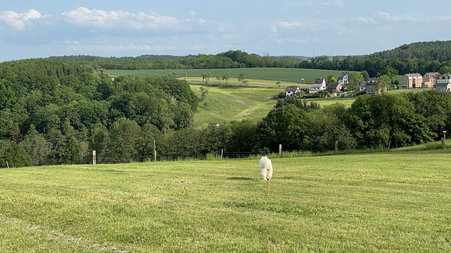 Wir sind dann aber zusammen auf dem frisch gemähten großen Bogen über die Wiese gewandert. Ich wäre ja lieber wieder gerade den Hang durchs hohe Gras hoch. Über meine große Feldwiese und die Wiese auf der anderen Seite der Straße sind wir dann zurück nach Hause.
