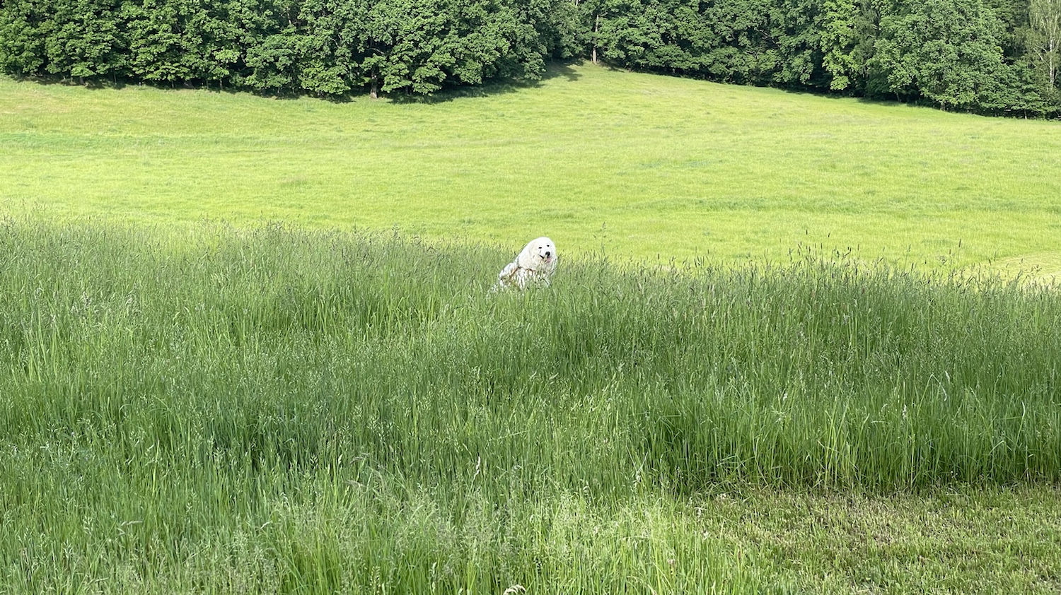 Dann ging es die große Wiese runter. Mein großer Mensch wollte den frisch gemähten großen Bogen über die Wiese laufen, aber ich wollte direkt geradeaus den Hang runter. Durch das hohe Gras. Und weil das mein Abendspaziergang ist, ist mein großer Mensch mit mir mitgekommen.