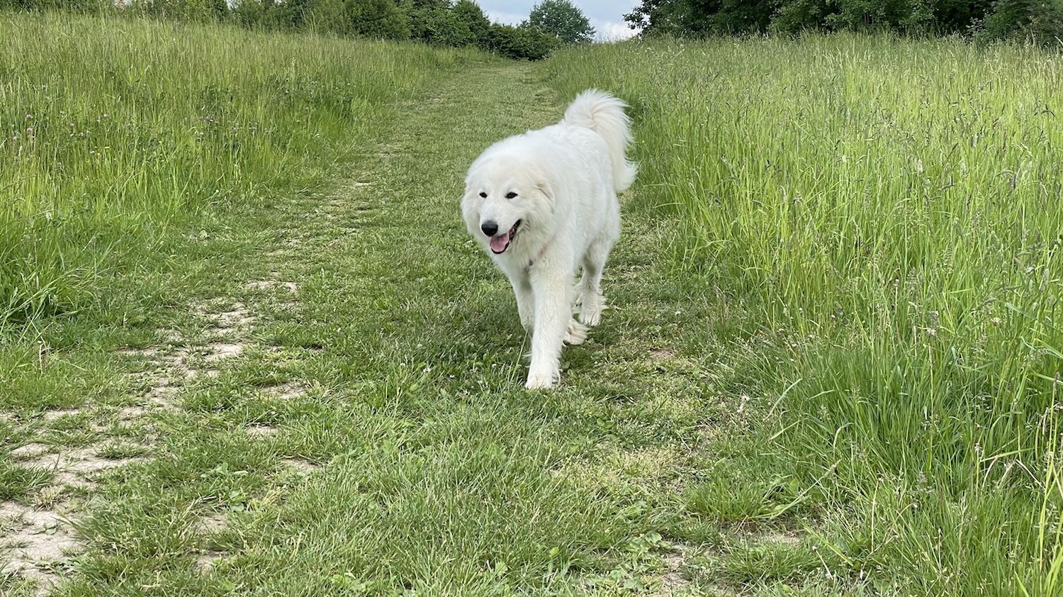 Und danach bin ich mit meinem großen Mensch über die Wiese geflitzt. Mitohne Leine. Das macht Spaß. Ich bleibe aber immer in der Nähe von meinem großen Mensch.