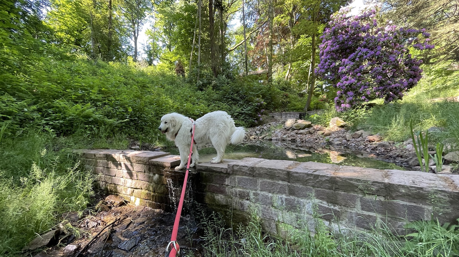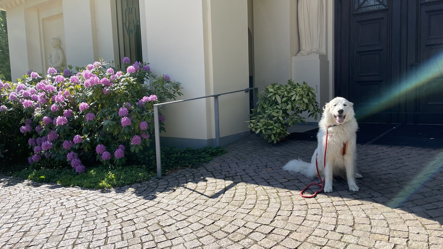 Meine große Menschenschwester hat mich später in meinen Garten gelassen. Heute war endlich wieder schönes Wetter. Deshalb hat meine liebe Sonne schon auf mich gewartet. Und dann kam mein großer Mensch. Zum Spaziergang.