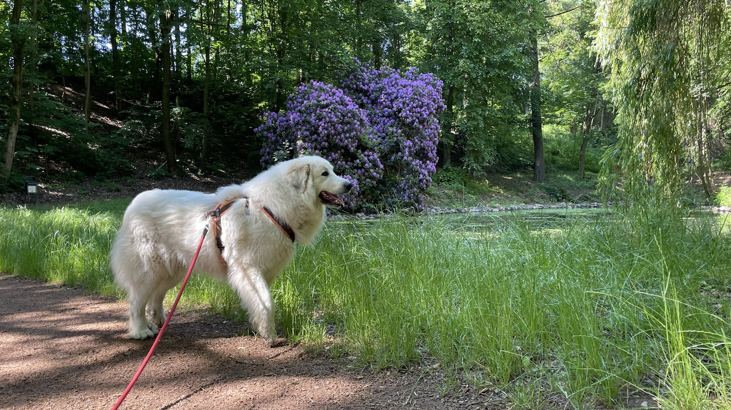 Dann haben wir meine große Menschin besucht. Bei ihrer Arbeit. Da ist ein ganz schöner Park mit ganz vielen roten Dentronen. Oder so. Und Menschen waren auch da. Die haben mich gestreichelt, weiiil, ich bin doch so kuschelweich.