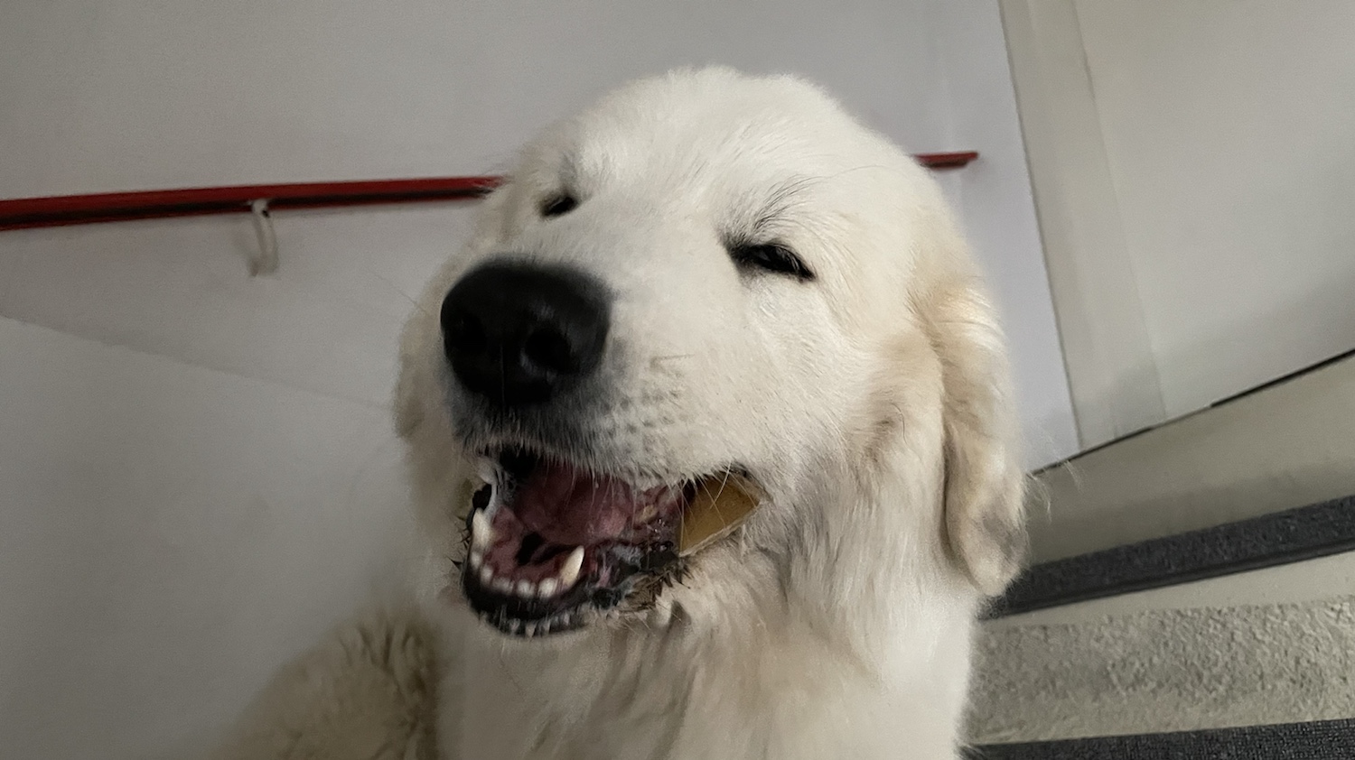 Dann gab es noch mein Abendfutter. Ich habe meinen großen Fleischknochen und ein bißchen Fleisch gefuttert und dann noch auf der Kellertreppe eine Rindviehcherkopfhaut geknabbert.
