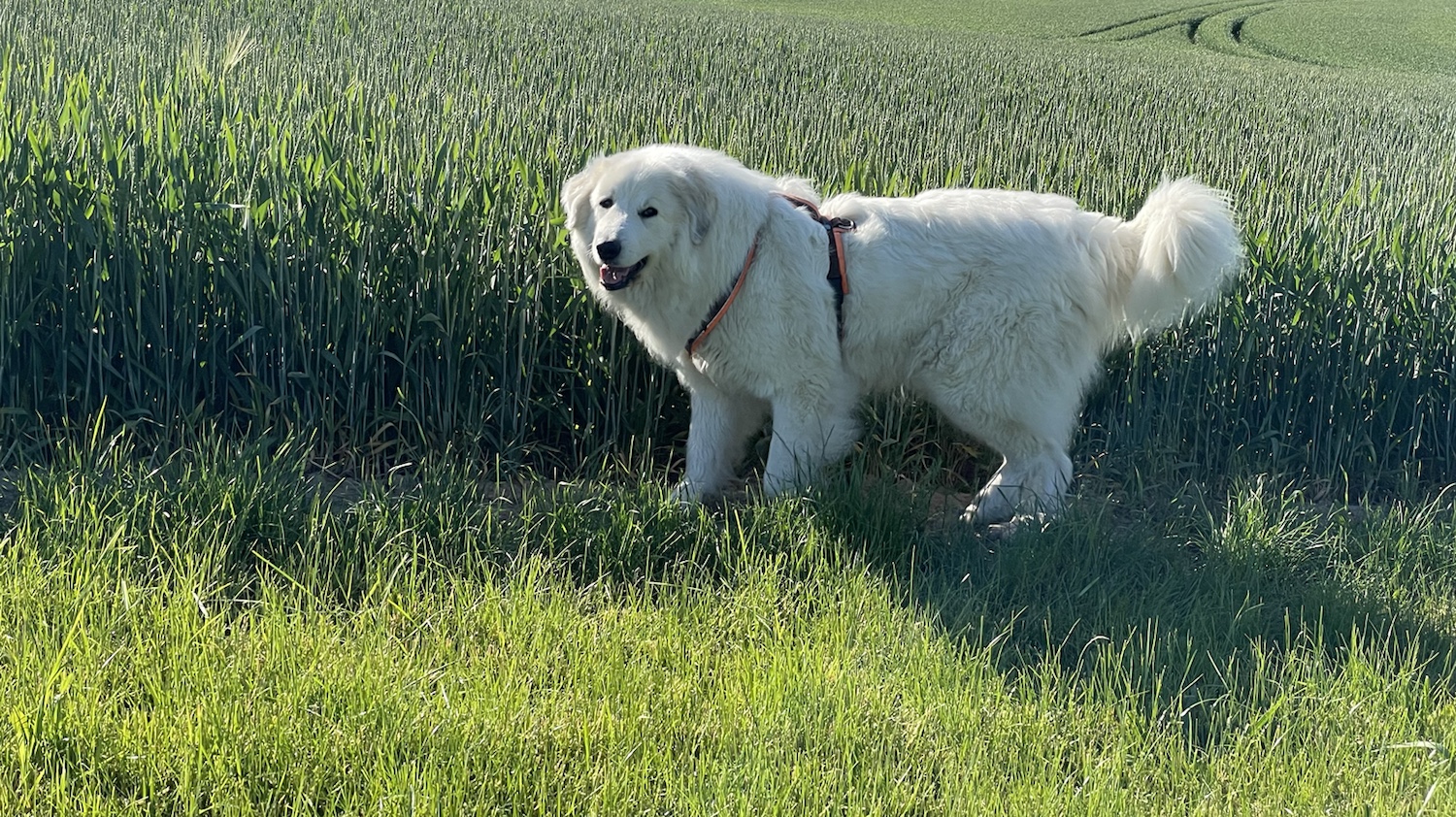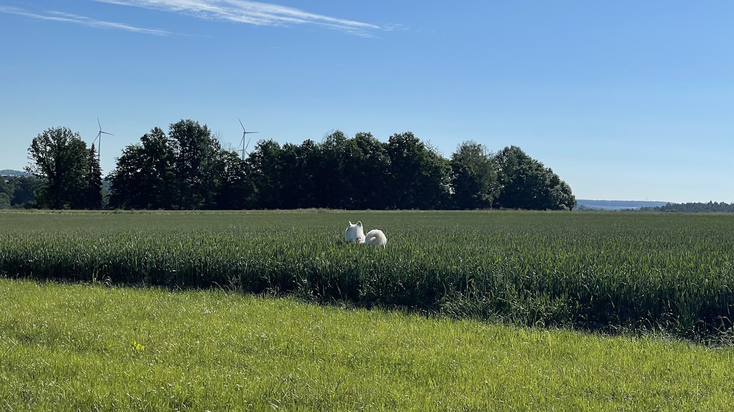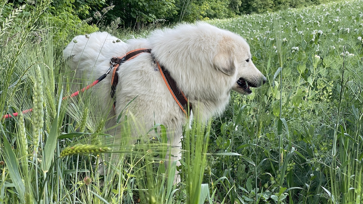 So macht man das nämlich. Man muß die Rehe aus dem hohen Feldgras rausbegleiten, weiiil, wenn die riesigen Ernteungeheuer kommen und das Feldgras wegmähen, dann ist das gefährlich für die Rehe und nicht gesundheitsfördernd. Weiiil, man kann die Rehe im hohen Feldgras vom Ernteungeheuer aus nicht gut sehen. Und da muß die Bella helfen, weiiil, die Bella kann die Reher im hohen Feldgras erschnuffeln und in den Wald begleiten. Ich bin eine Herdenschutzhündin. Jawoll!