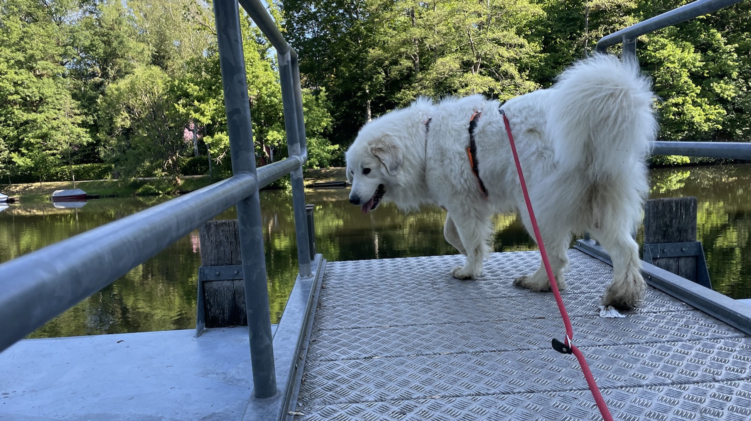 Dann sind wir auf der Wiese wieder zurückgegangen. Ich habe meine Leine wiederbekommen und wir sind zum großen Fluß mit dem komischen Namen gegangen. Ich habe wieder über den Fluß geguckt.