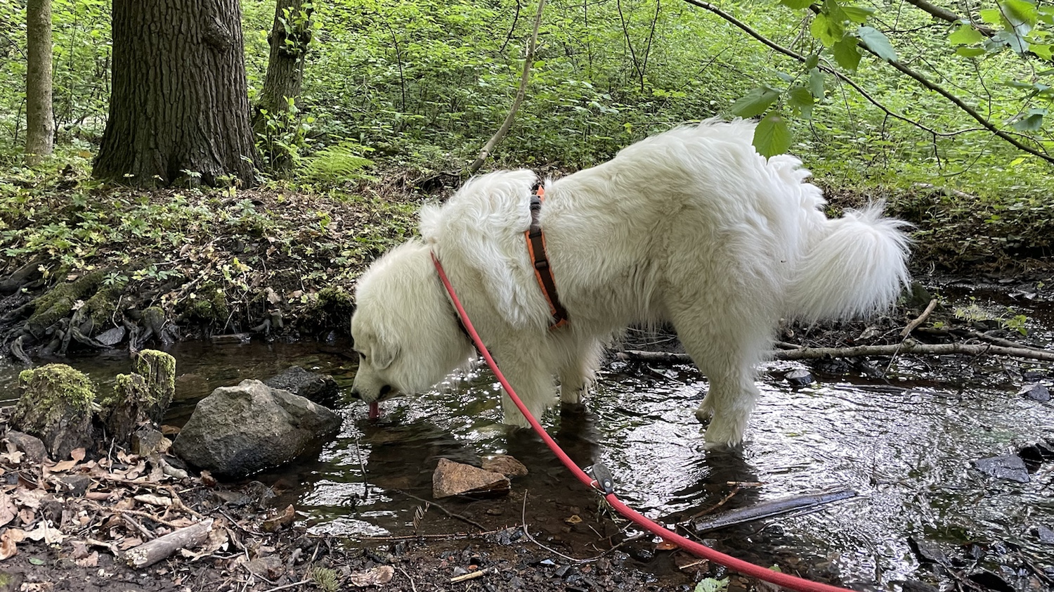 Am kleinen Bächlein war eine Ente. Mit der wollte ich spielen. Da bin ich losgeflitzt. Mein großer Mensch mußte da meine Leine loslassen, sonst hätte ich den umgerissen. Ich bin doch so groß und stark.