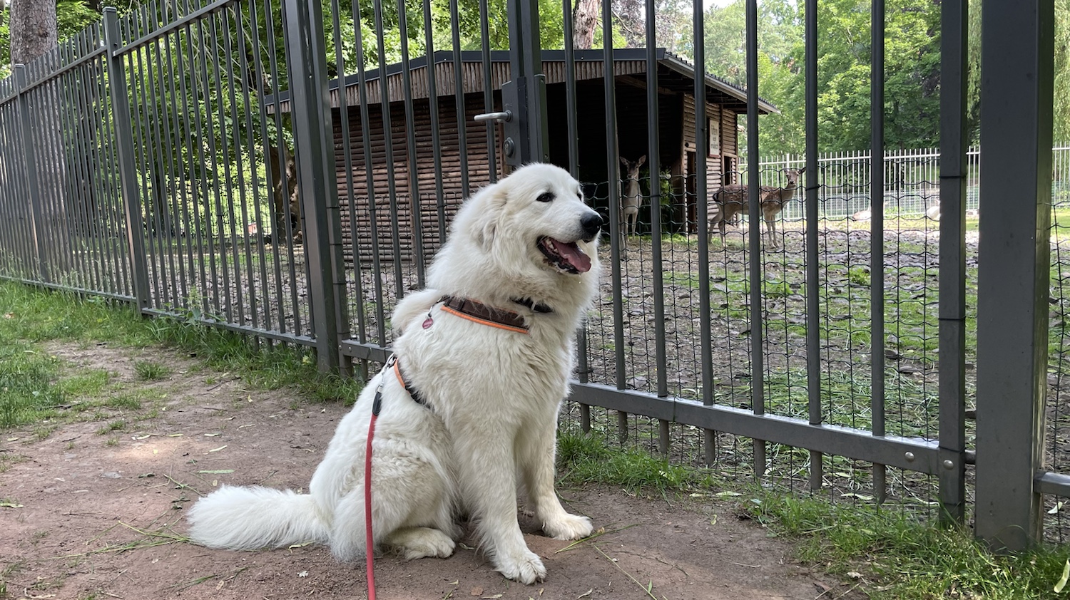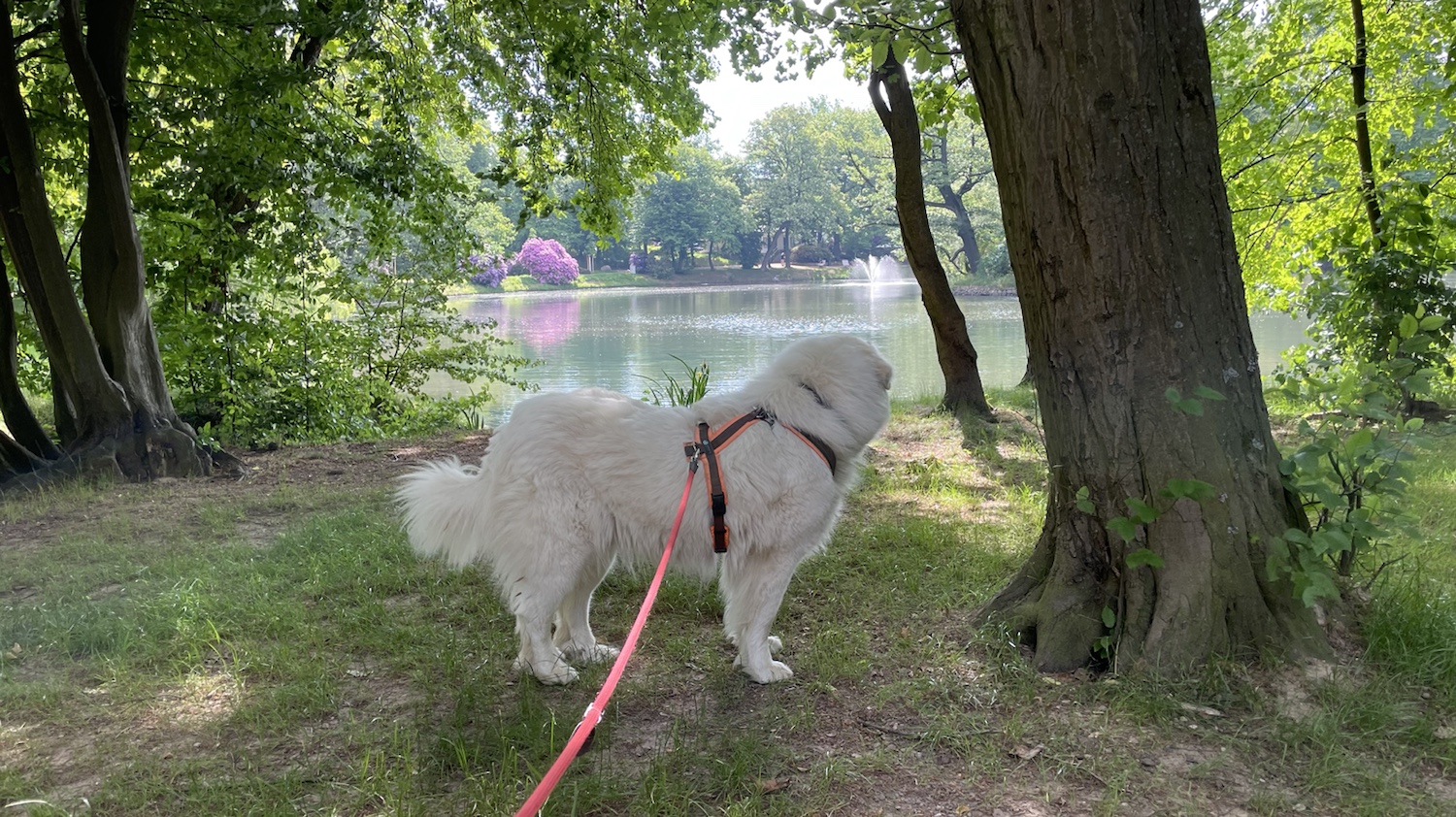 Mich haben gleich am Eingang zwei Hunde begrüßt. Jungs. Zum Glück. Dann sind wir eine schöne Runde um den großen Ozean Schwanenteich gelaufen. Ich durfte überall schnuffeln. Und bei den Rehen und Hirsch Hubert sind wir auch gewesen.