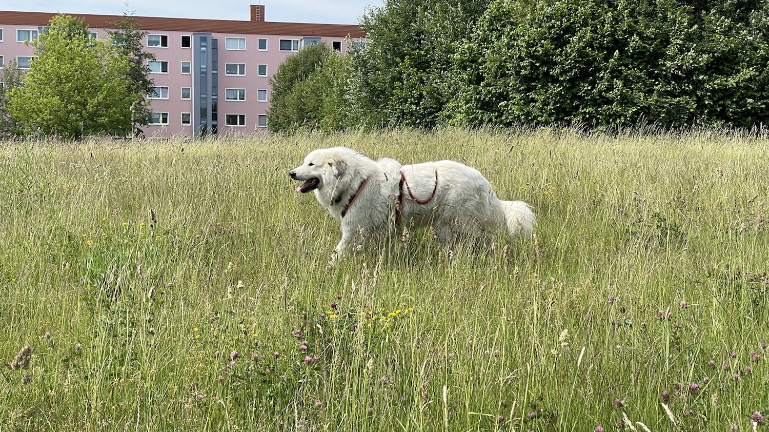 Dann sind wir nach Hause gelaufen. Über die große Wiese. Da durfte ich wieder ganz alleine durch das Gras laufen. Das blüht jetzt alles ganz schön. Und dann sind wir durch mein Wohngebiet nach Hause gegangen.