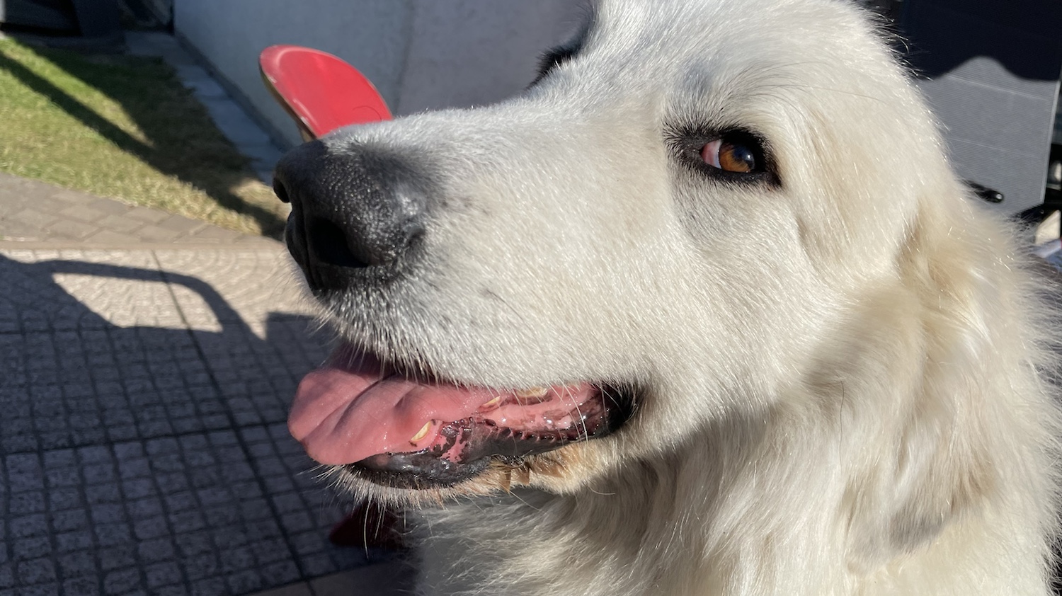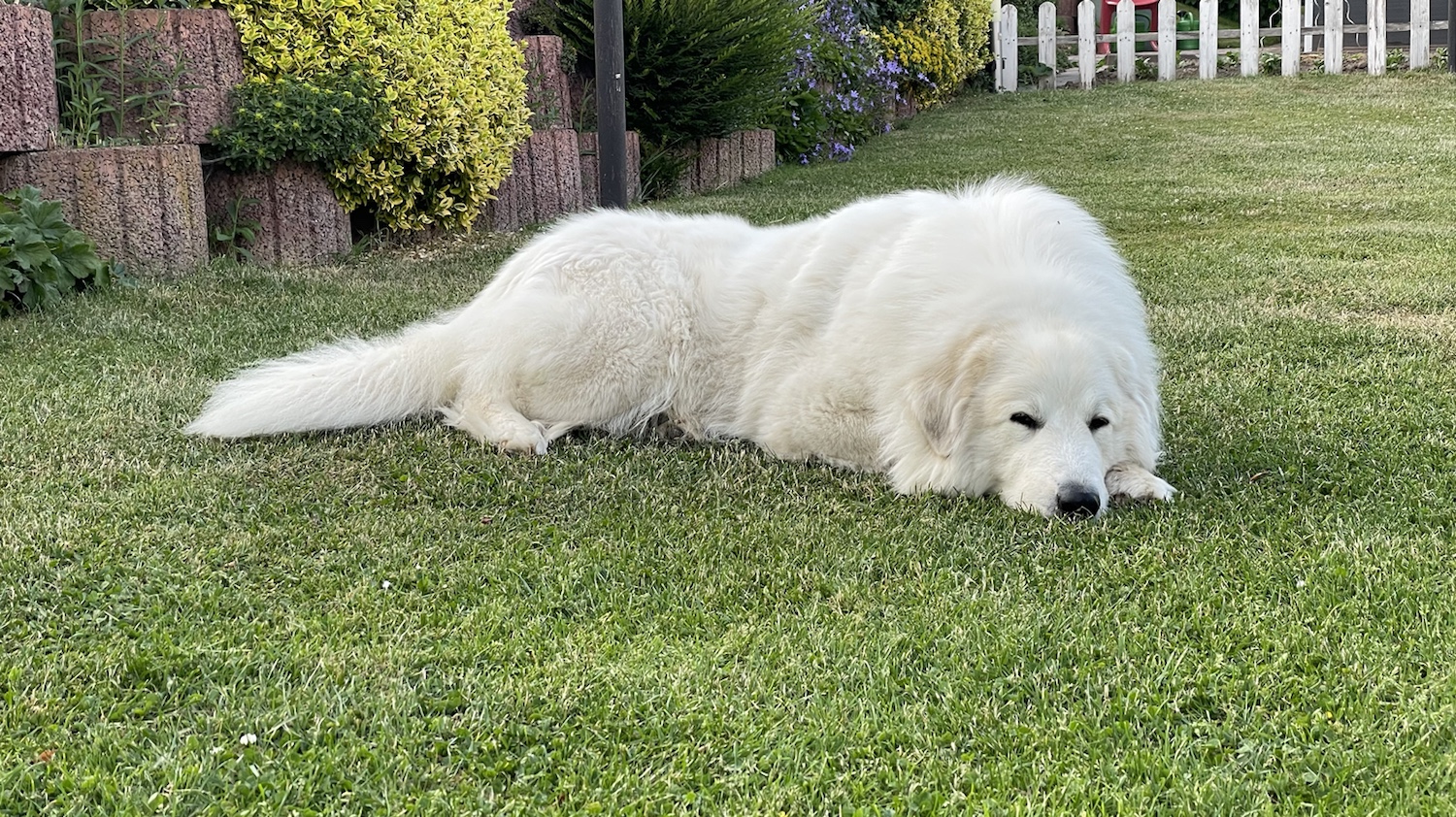 Nachmittags war es dann schöner, das Wetter. Sogar meine liebe Sonne war bei mir in meinem Garten. Und dann hat meine große Menschenschwester Geburtstagsbesuch bekommen und alle meine Menschen haben auf meiner Terrasse Kuchen gefuttert und Kaffee getrunken und ich durfte alle bewachen. Das kann ich gut. Ich bin eine Herdenschutzhündin. Eine Pyri bin ich!