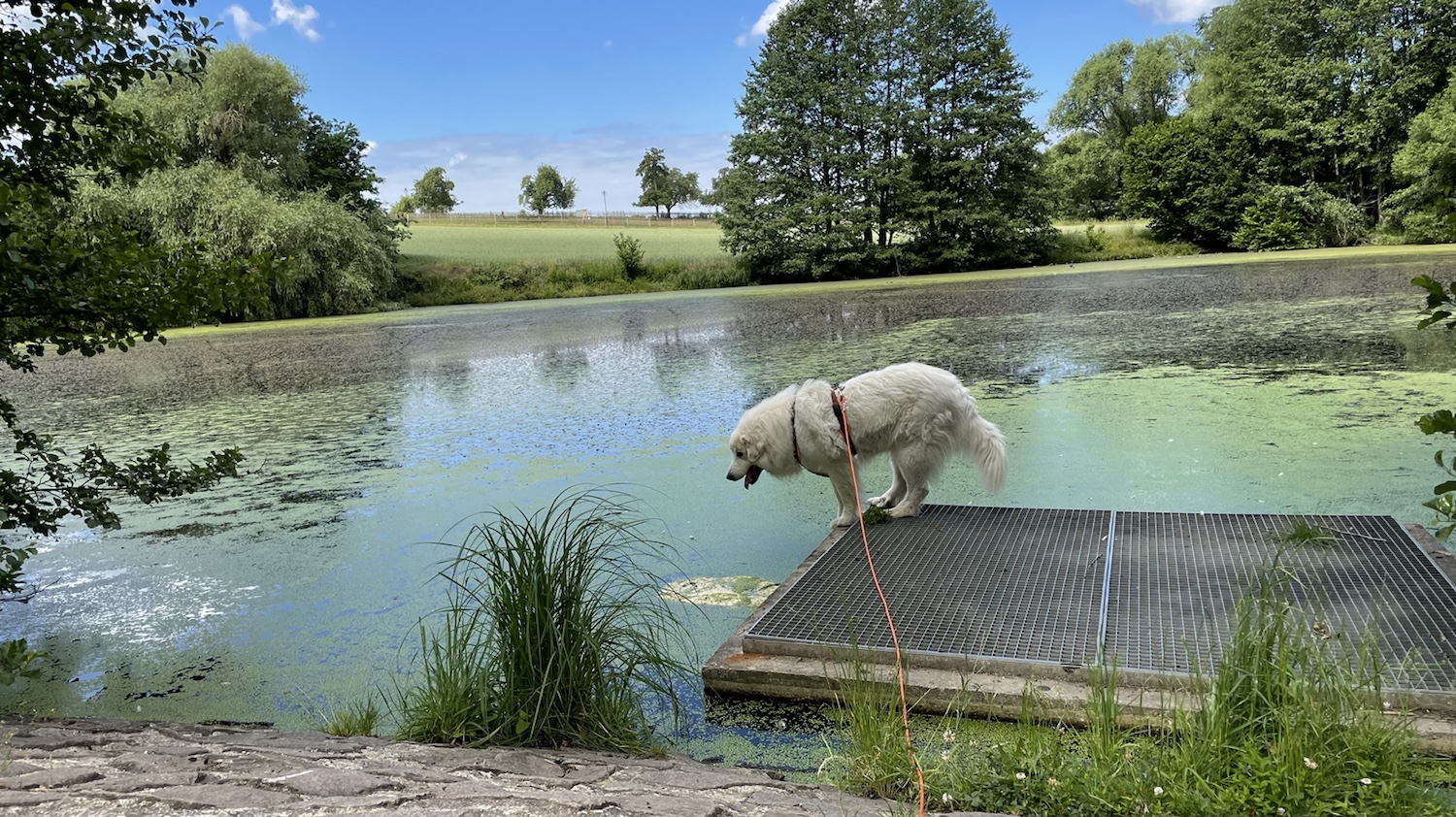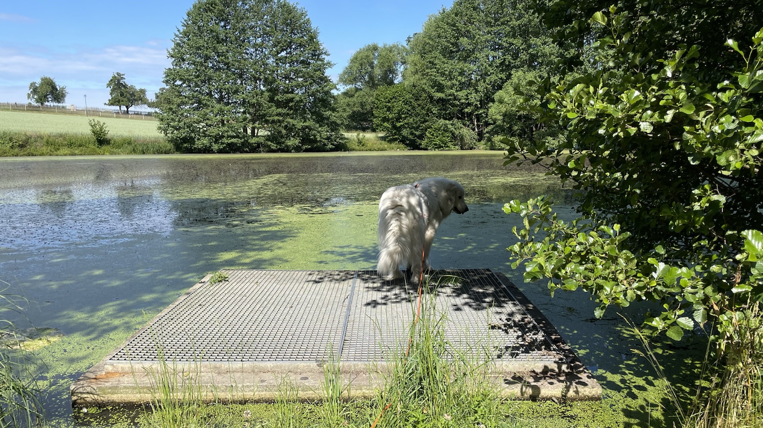 Wir sind über die große Wiese geschlendert und an der kleinen Wiese vorbei zum große Teich. Der ist ein Ozean, weiiil, da ist Wasser drin. Und Enten. Ich gugge immer. Und trinke Wasser. Aus dem Ozean, der Teich heißt.