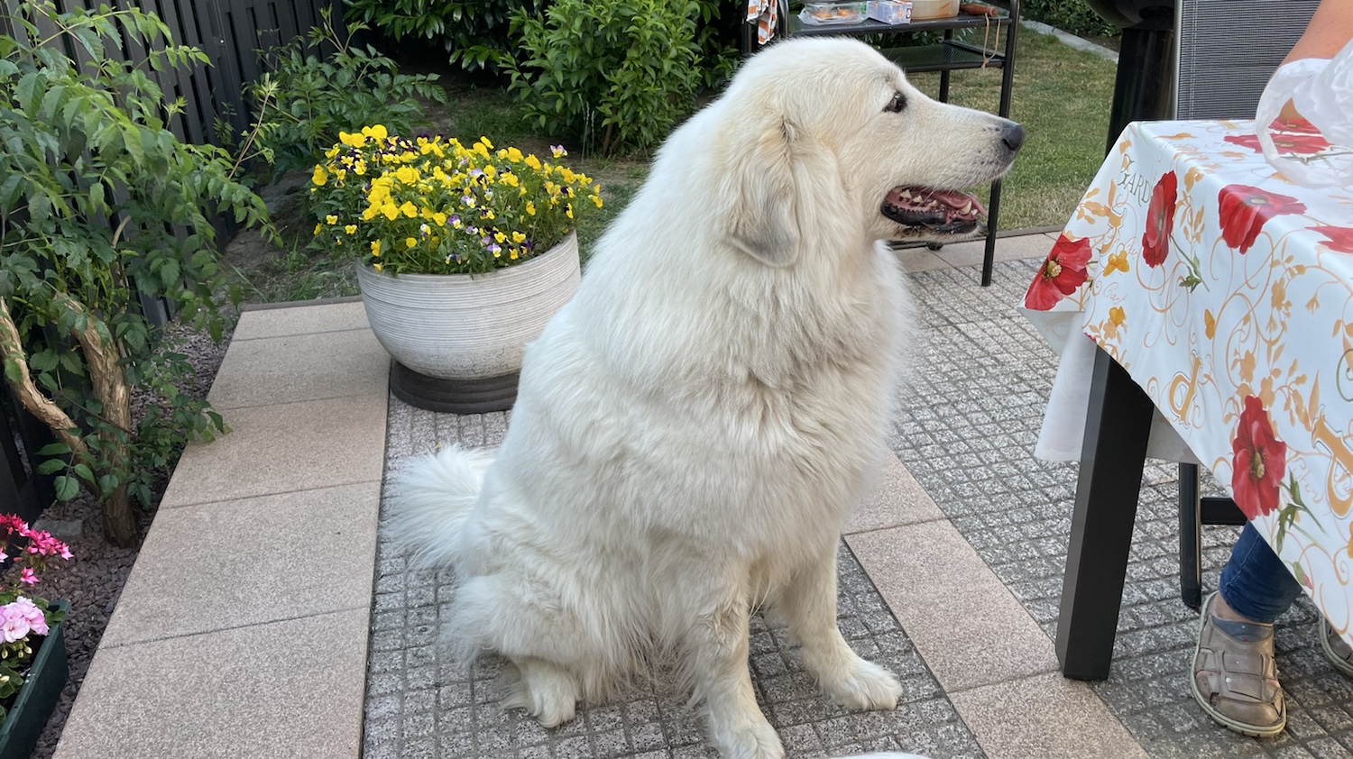 Da habe ich wieder auf meinen großen Mensch gewartet. Wegen Spaziergang. Und gerufen habe ich. Meinen großen Mensch. Draußen und dann bin ich auch rein in meinen Keller und habe da gerufen. Und mein großer Mensch ist dann zu mir gekommen und hat mir erklärt, daß er auch erst noch frühstücksfuttert. Und da bin ich wieder raus und habe ganz ruhig gewartet.