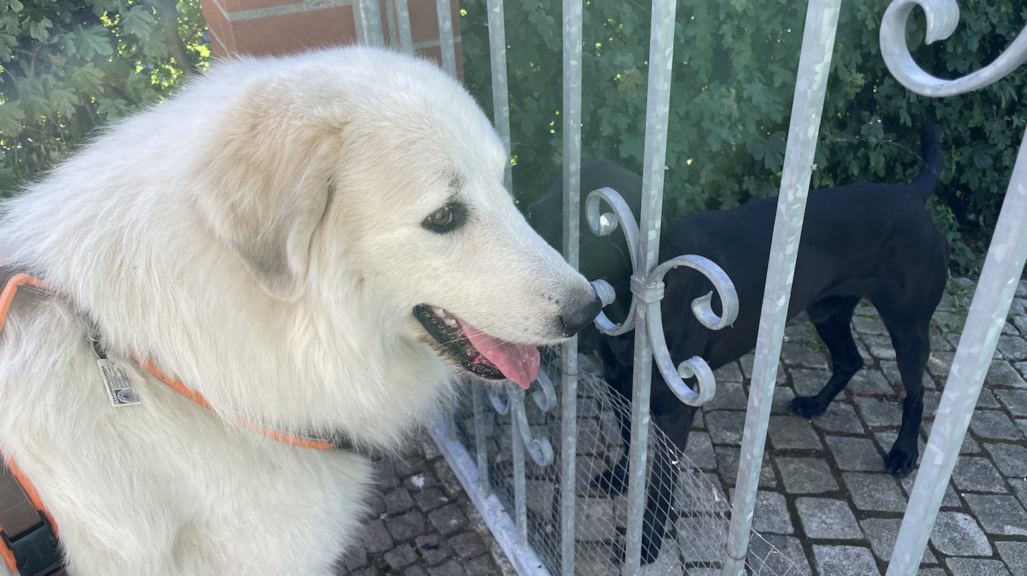 Und dann sind wir beim Aaron vorbei. Und der war heute in seinem Garten und da konnten wir uns auch am Gartentor anschnuffeln. Der Aaron ist mein Freund.