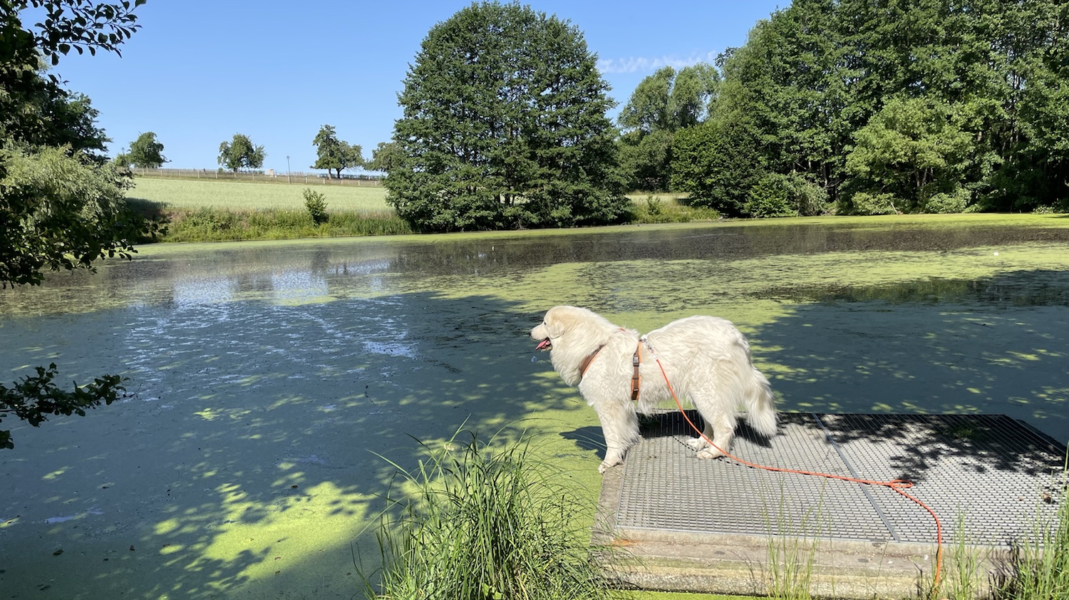 An der kleinen Wiese vorbei sind wir zum großen Ozean, der Teich heißt. Die kleine Wiese ist auch ganz kurz gemäht und der Ozean, der Teich heißt, ist ganz grün, weiiil, da schwimmt Zeugs drauf rum. Gelumpe. Grünes. Das tapse ich immer mit meinem Pyripfötchen weg, damit ich trinken kann. Heute haben wir den Reiher und ein Entenpärchen gesehen.