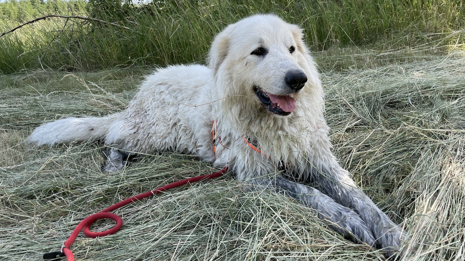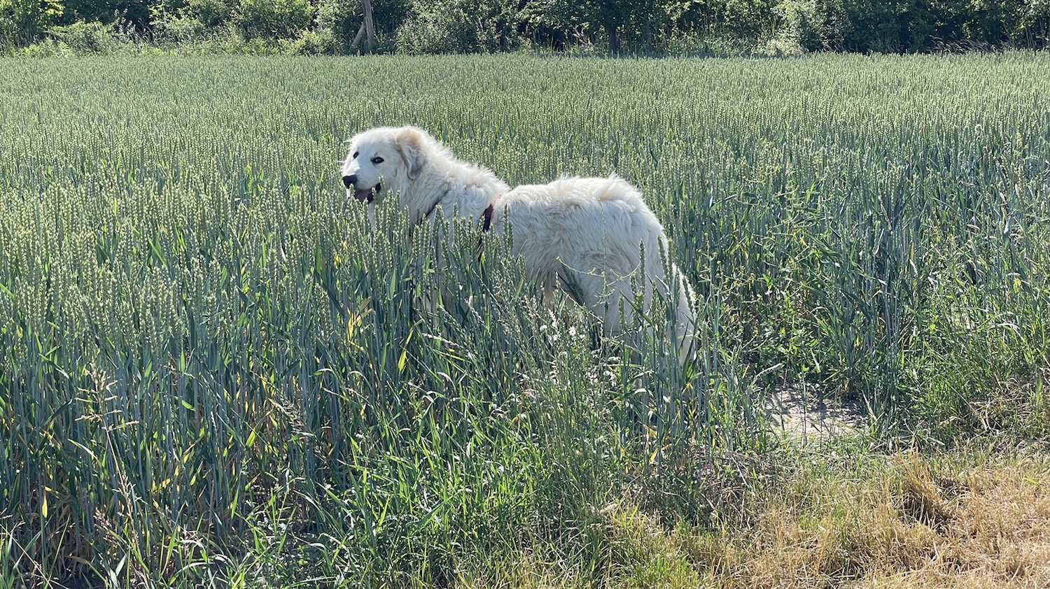 Ganz viel Schlamm war da. Dunkelweißer. Igittigitt. Ich hatte ganz dunkelweiße Beinchen. Und wir sind dann über die kleine Wiese gegangen. Da habe ich mich nochmal ausgeruht und im frisch gemähten Gras habe ich geschnuffelt und mich gewälzt.