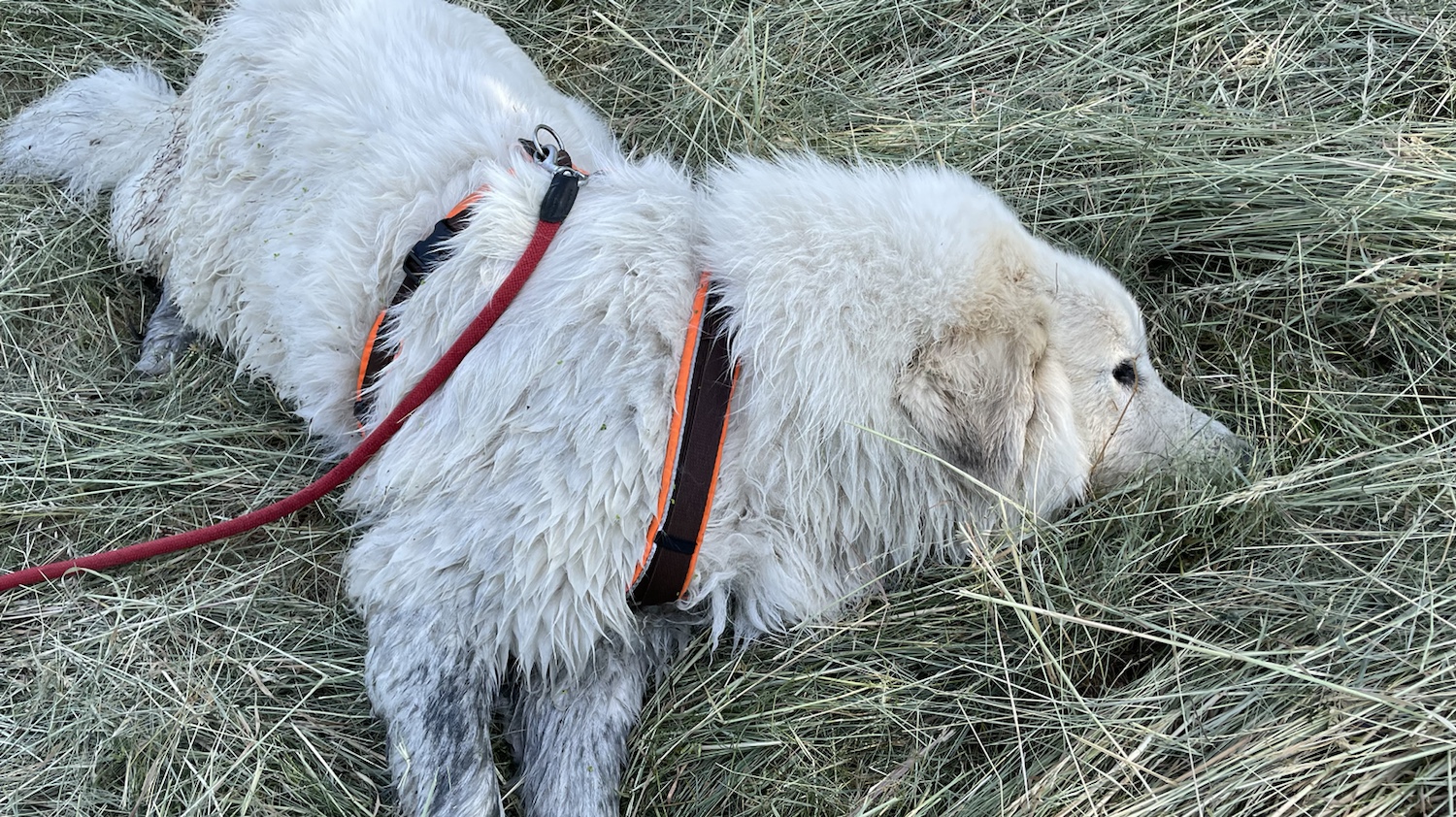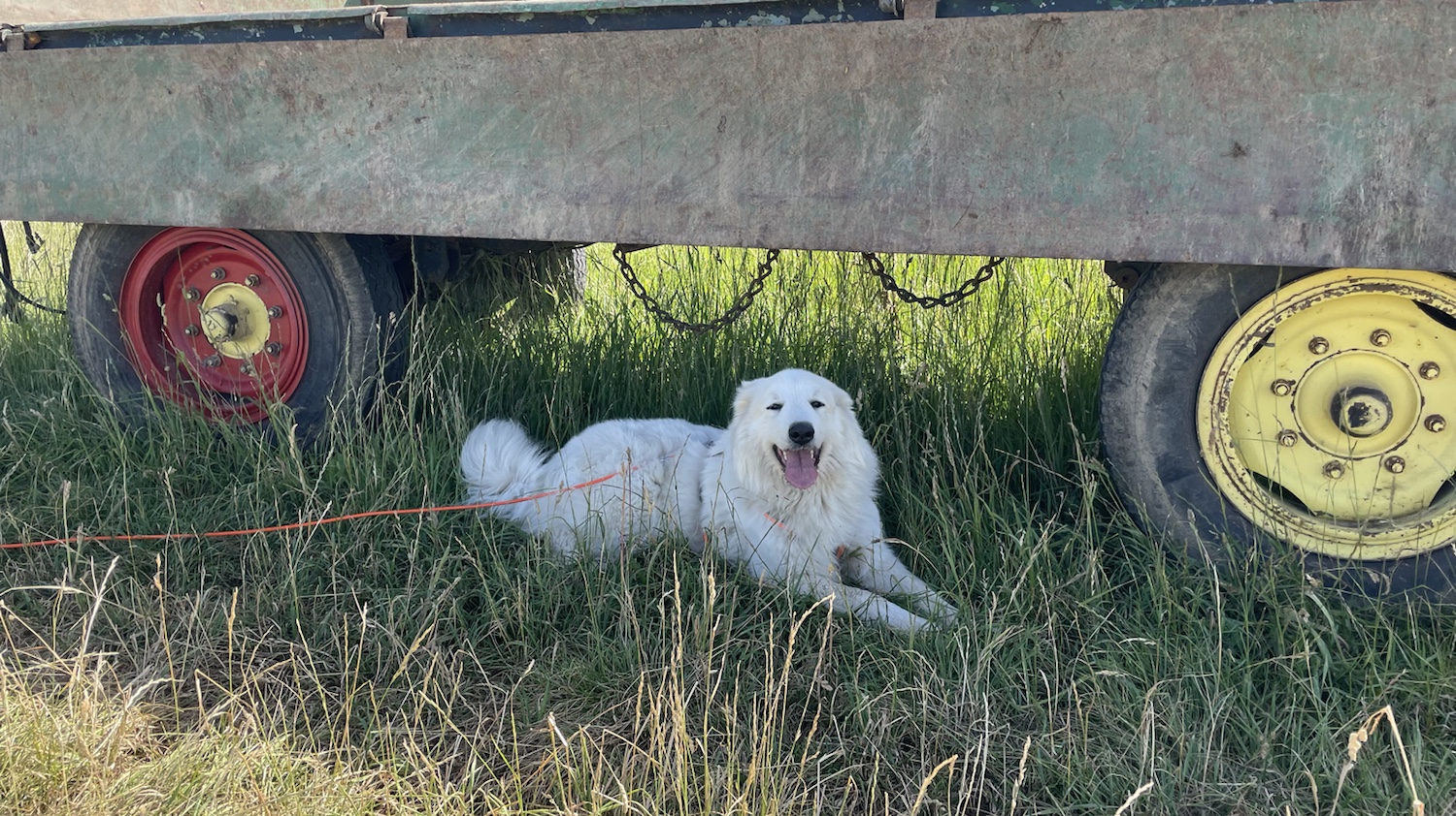 Auf der großen Wiese stand ein großer Hänger. Und der hat schönen Schatten gemacht. Und da habe ich mich gleich ins Gras in den Schatten gelegt und nochmal Pause gemacht. Und ich habe Trockenfutter und Wasser bekommen.