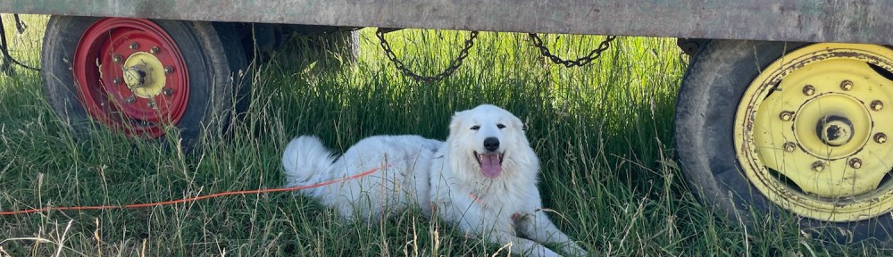 Auf der großen Wiese stand ein großer Hänger. Und der hat schönen Schatten gemacht. Und da habe ich mich gleich ins Gras in den Schatten gelegt und nochmal Pause gemacht. Und ich habe Trockenfutter und Wasser bekommen.