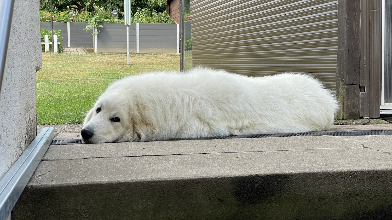 Nachmittags ist mein großer Mensch im Keller mit seinem Rad gefahren. Ich habe draußen auf ihn aufgepaßt. Damit niemand stören kann. Aber dann hat es wieder geregenwettert und ich bin auch rein.