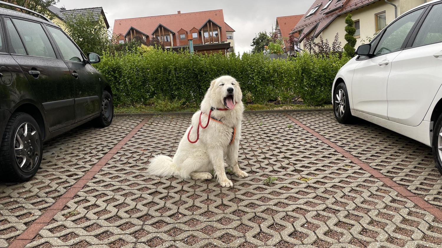 Wir haben dann aber trotzdem unseren Abendspaziergang gemacht. Durch mein Wohngebiet. Obwohl es noch ein bißchen geregenwettert hat. Auf dem Heimweg habe ich zum knabbern eingeparkt.