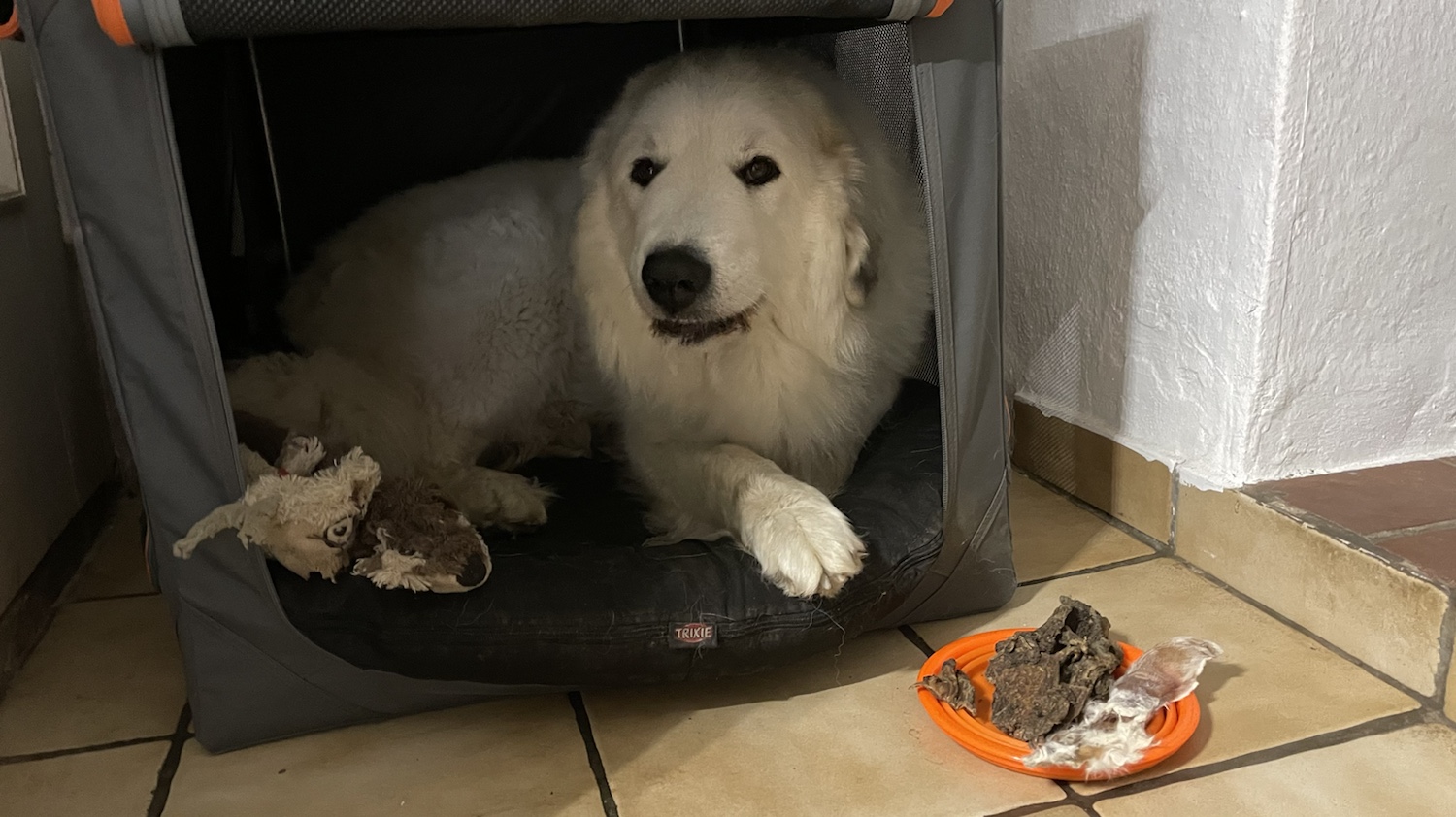 Heute früh gab es eine Sensation. Ich habe erst schön mit meinem großen Mensch gefrühstücksfuttert und danach habe ich mich seit ganz langer Zeit mal wieder in mein kleines Ferienhäuschen gekuschelt und da geknabbert.