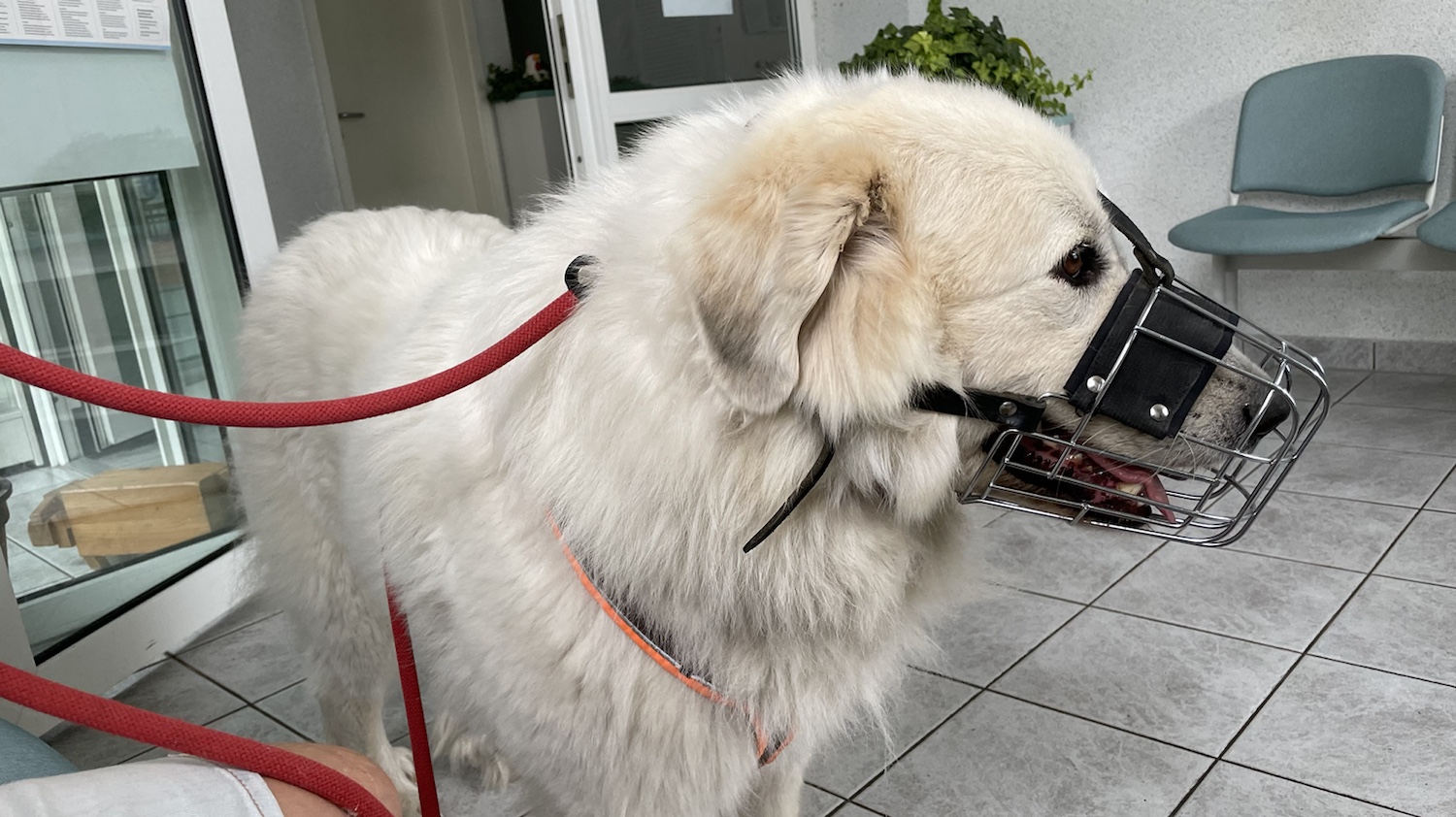 Aber heute sind wir nicht zur Hundeschule und auch nicht zum Spaziergang gefahren. Heute ging es zum Tierarzt. Da habe ich erstmal wieder meinen Nasenzaun angezogen bekommen. Damit ich schön gefährlich aussehe.