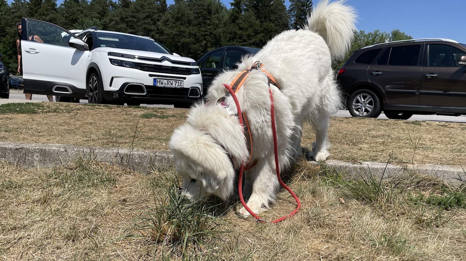 Dann sind wir nochmal Trinken für mein weißes französianisches Auto kaufen gewesen. Da haben wir wieder eine Pause gemacht und ich konnte am Parkplatz auf einer großen Wiese schnuffeln. Da war auch ein großer Hund. Ein Junge. Der hat auch geschnuffelt. Das war in Slowenien. Das ist ein anderes Land als das Österreich.