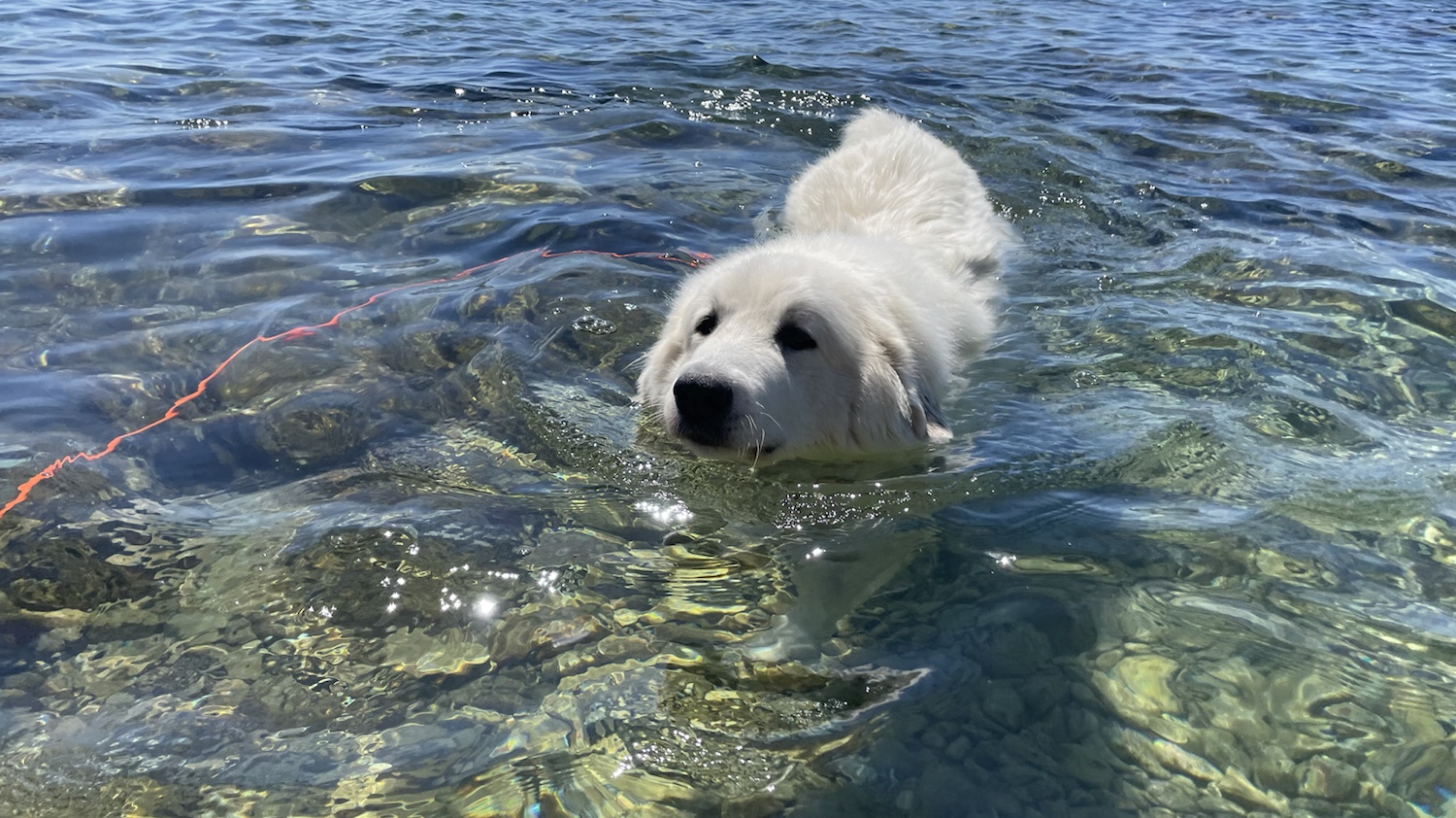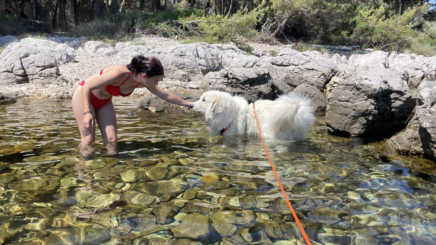 In der Bucht angekommen gehen wir aber zuerst ins Strandrestaurant um einen Tisch zu reservieren. Anschließend geht es zurück an den Hundestrand. Bella geht auch sofort mit ins Wasser. Inzwischen ist sie aber nicht mehr so dultsam gegenüber anderen Hunden wie an den bisherigen Tagen. Die Berghündin fühlt sich langsam heimisch und kehrt ihre territoriale Seite heraus. Geht aber alles noch. Wir müssen nur aufmerksam sein.