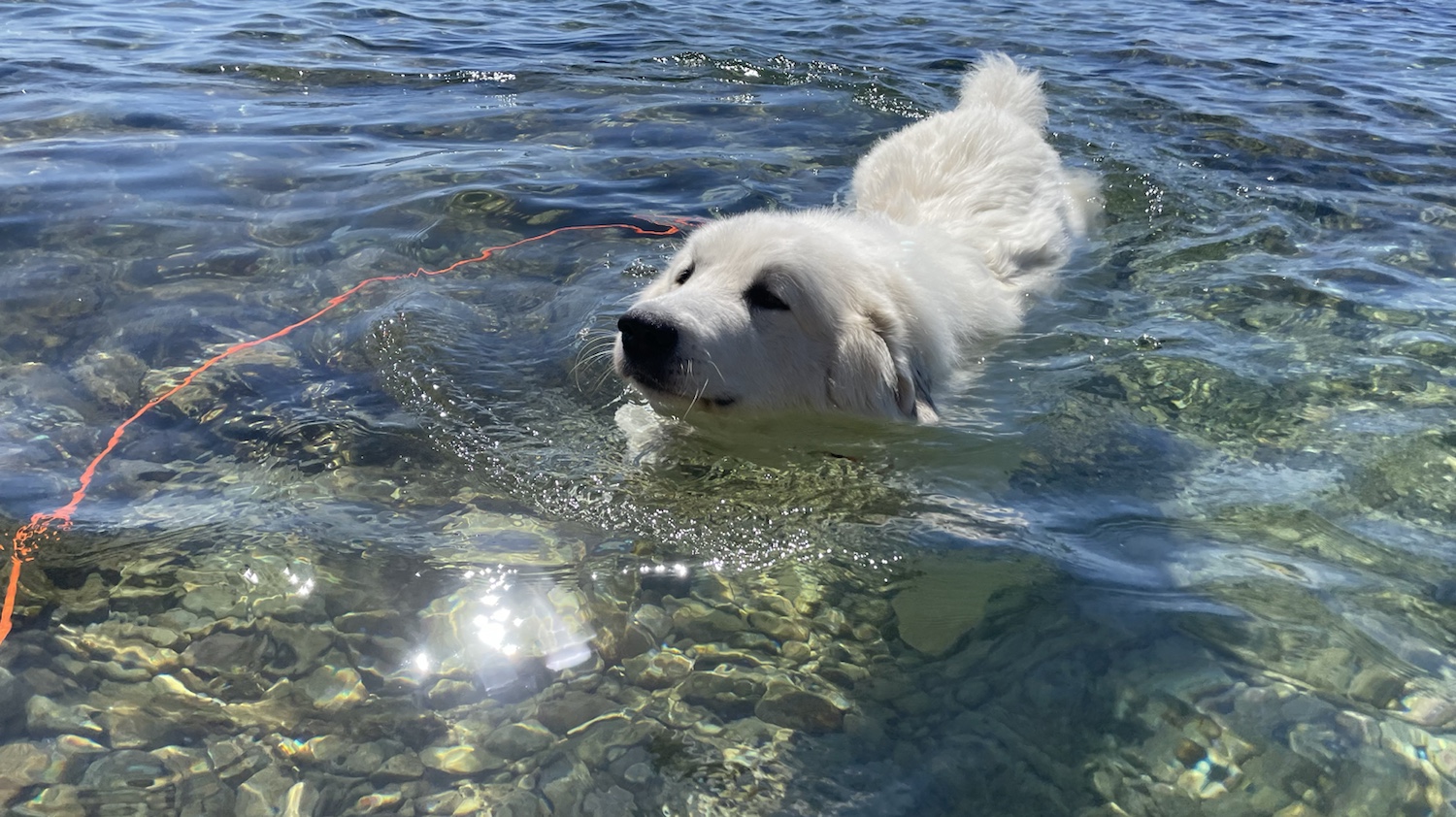 Wir sind wieder an den Hundebadestrand gegangen. Und ich bin gleich mit in den Ozean baden gegangen. Geschwimmelt bin ich wieder. Das kann ich. Und danach haben wir uns im Schatten ausgeruht.