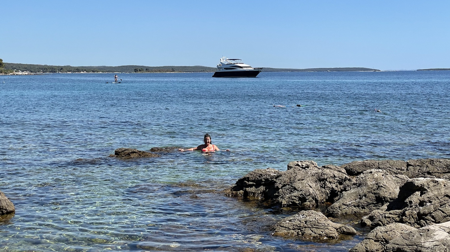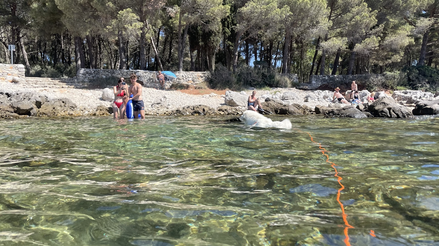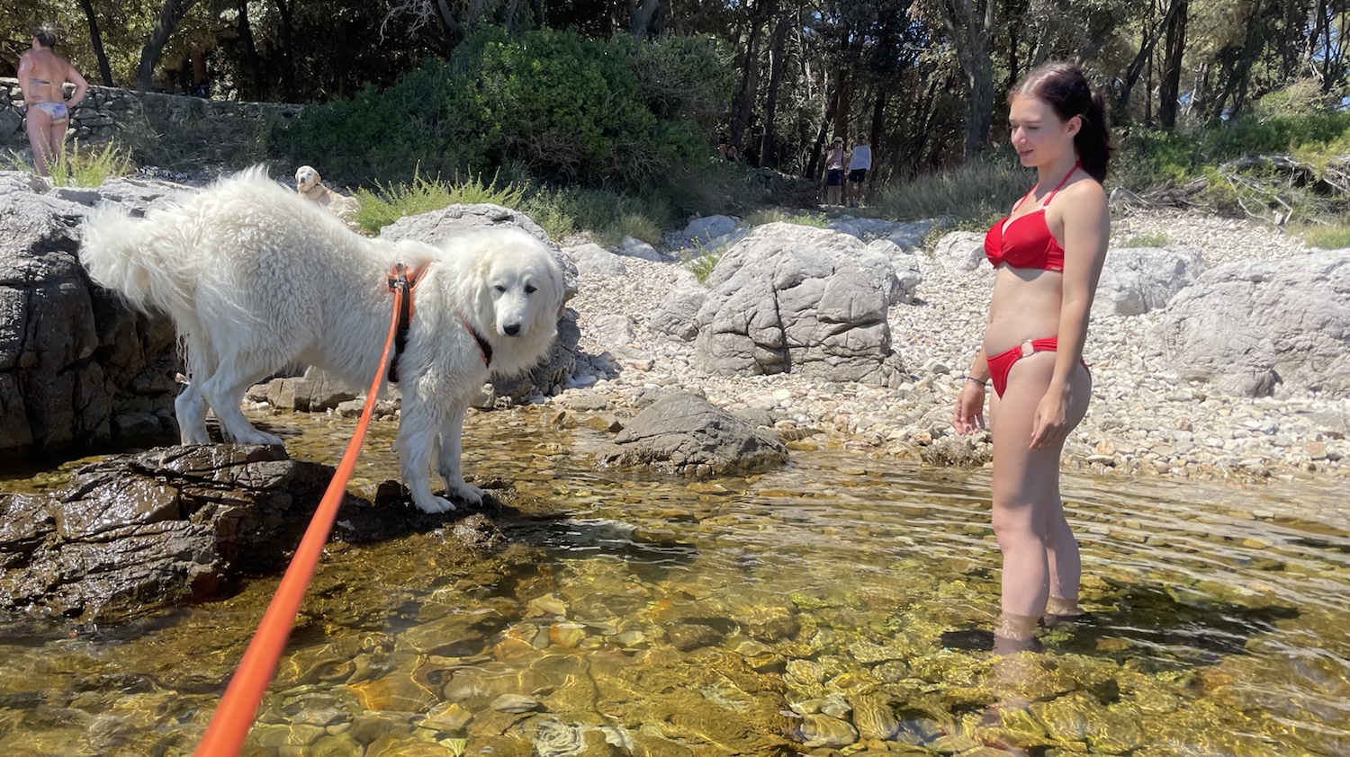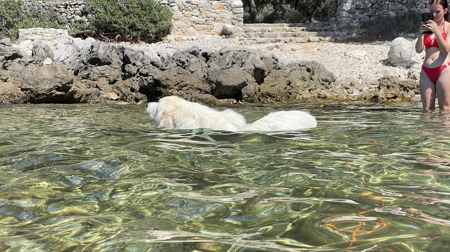 Nach dem Mittag sind wir dann ein Stück weiter gelaufen. Überall gibt es kleine Durchgänge zu der steinigen Küste. Wir haben uns einen schönen kleinen Platz mit Sonne und Schatten ausgewählt. Bella wollte allerdings nicht nochmal mit ins herrlich klare Wasser.
