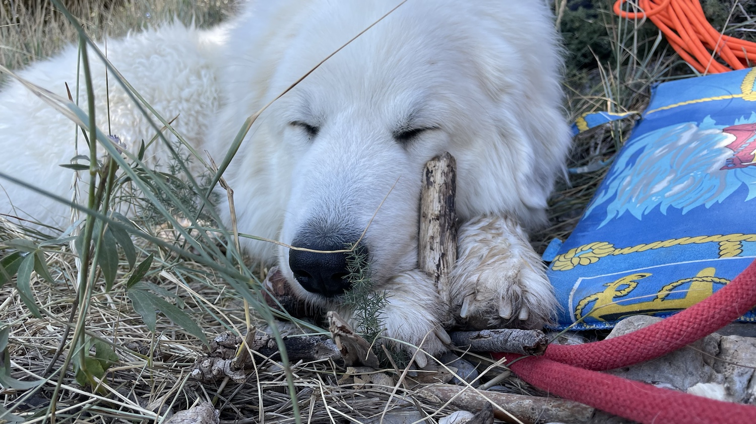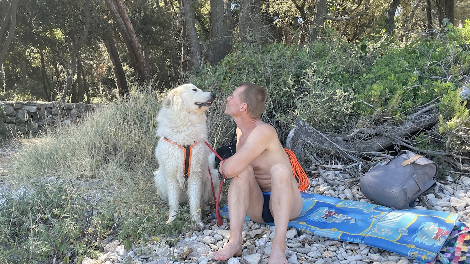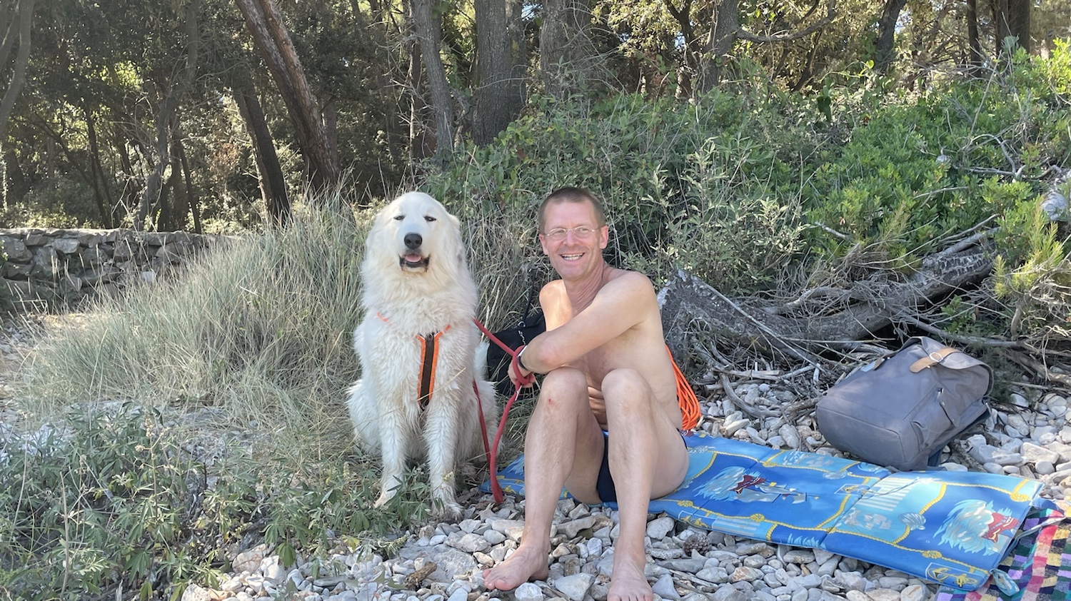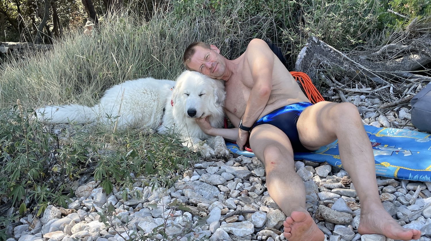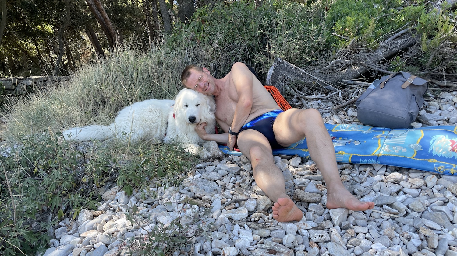 Dann haben wir uns am Steinestrand ausgeruht. Ich habe ein Holz gekaut und ein bißchen geschlummert. Die Menschen sind aber nochmal baden gewesen.