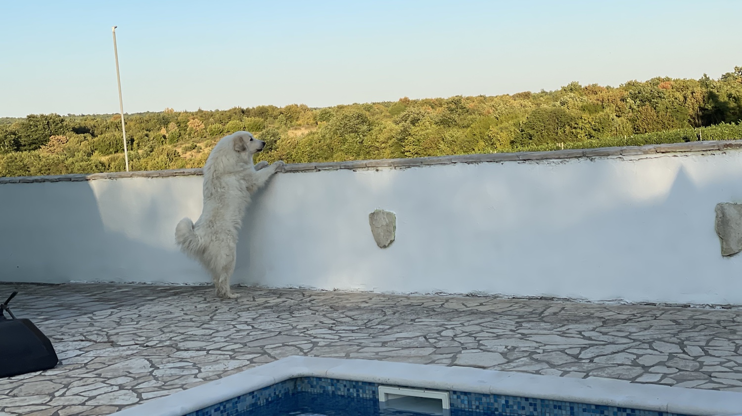 Dann gab es Abendfutter und später haben wir noch grilliert. Am Pool. Ich durfte wieder mitgrillieren. Und ich habe meine Bratwurscht bekommen. Und zwischendurch habe ich geschimpft. Weiiil, da waren viele Menschen vor unserem Urlaubsgarten. Aber der gehört jetzt der Bella und ihren Menschen, weiiil. Wir machen hier Urlaub und da werden alle anderen verbellt. Die Leute fanden das auch gut und ich habe ein Lob bekommen. Weiiil, meine Herde beschützen ist meine Aufgabe.