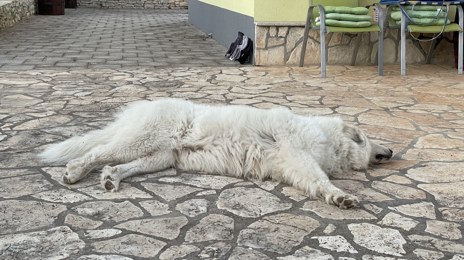 Dann sind wir zurück zu meinem weißen französianischen Auto und erst noch einkaufen gefahren. Da habe ich wieder im Autogewartet. Hat heute nicht lange gedauert. Und dann sind wir in unser schönes Ferienhaus zurück. Da bin ich gleich rein ins Kühle und habe erstmal kurz geschlummert. Das war so schön kühl.