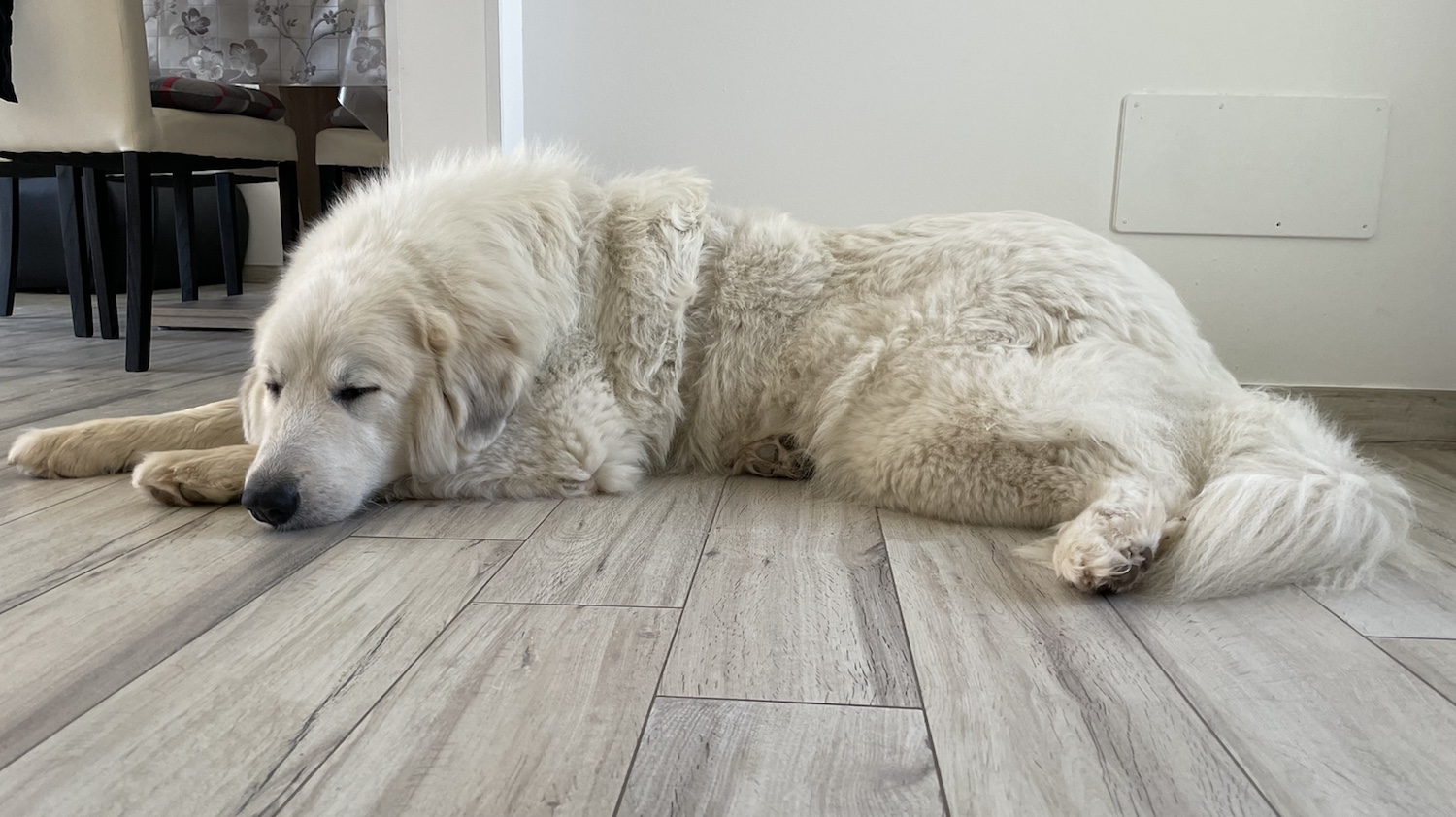 Die Bella hat heute nicht nur Urlaub, sondern auch noch Wochenende! Da kann ich wunderschön ausschlummern. Ganz lange. Das machen meine Menschen auch so. Dann gibt es Frühstück. Ich futtere nichts. Mein großer Mensch hat mir aber einen leckeren Futterteller gemacht. Aber wenn das so warm ist, da braucht die Bella nicht so viel Futter.
