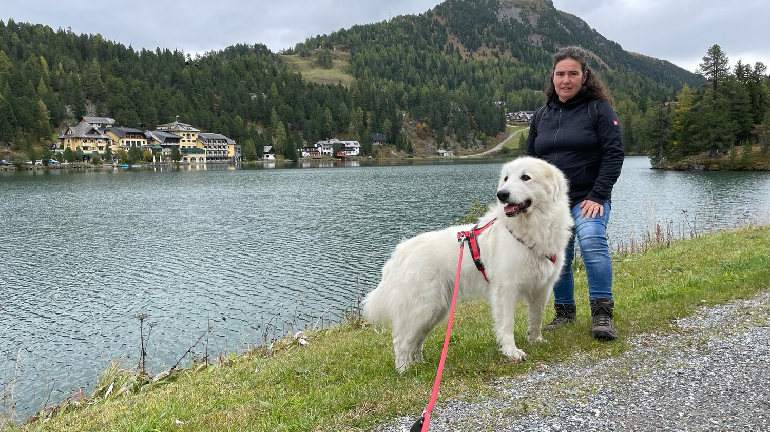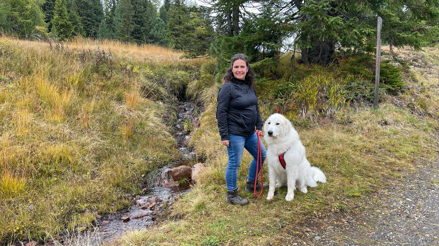 Auf unserem Rückweg machen wir noch einen kurzen Stop im „s‘Hüttenplatzerl“. Wir trinken aber nur was, sind noch satt vom Frühstück. Dann geht es weiter an den See. Bella wäscht noch ihre Pfötchen und scheucht eine Ente am Ufer auf. Die Pyri ist ohnehin sehr unruhig seit wir hier sind.