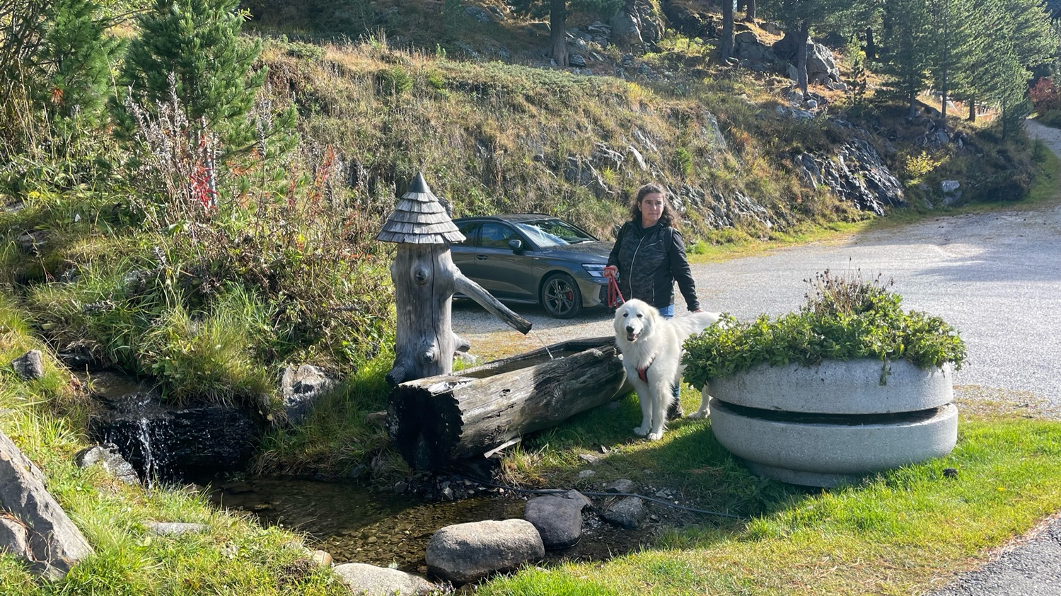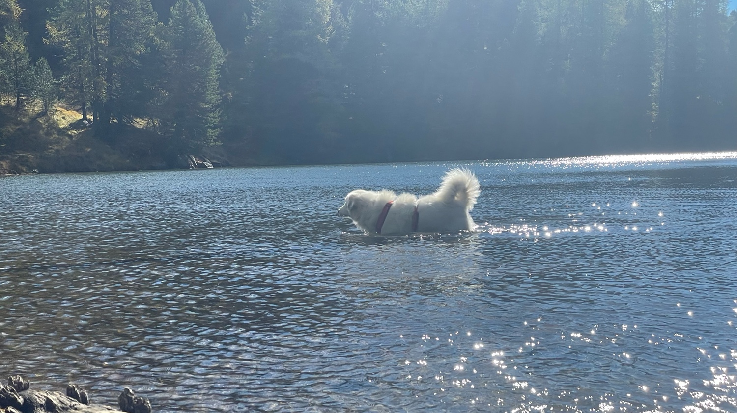 Zuerst steigen wir von unserem Berg herunter zum Turracher See. Die Straße meiden wir, laufen am Ufer beim „Jägerwirt“ Richtung Mei-Zeit-Siedlung. Hinter dem Hotel „Hochschober“ biegen wir zum „Mythos Edelstein Kranzelbinder“ ab. Auf dem Drei-Seen-Wanderweg geht es dann weiter zum Grünsee. Am Nordufer lassen wir Bella mal ins Wasser. Sie ist heute extrem angespannt, sehr unruhig.