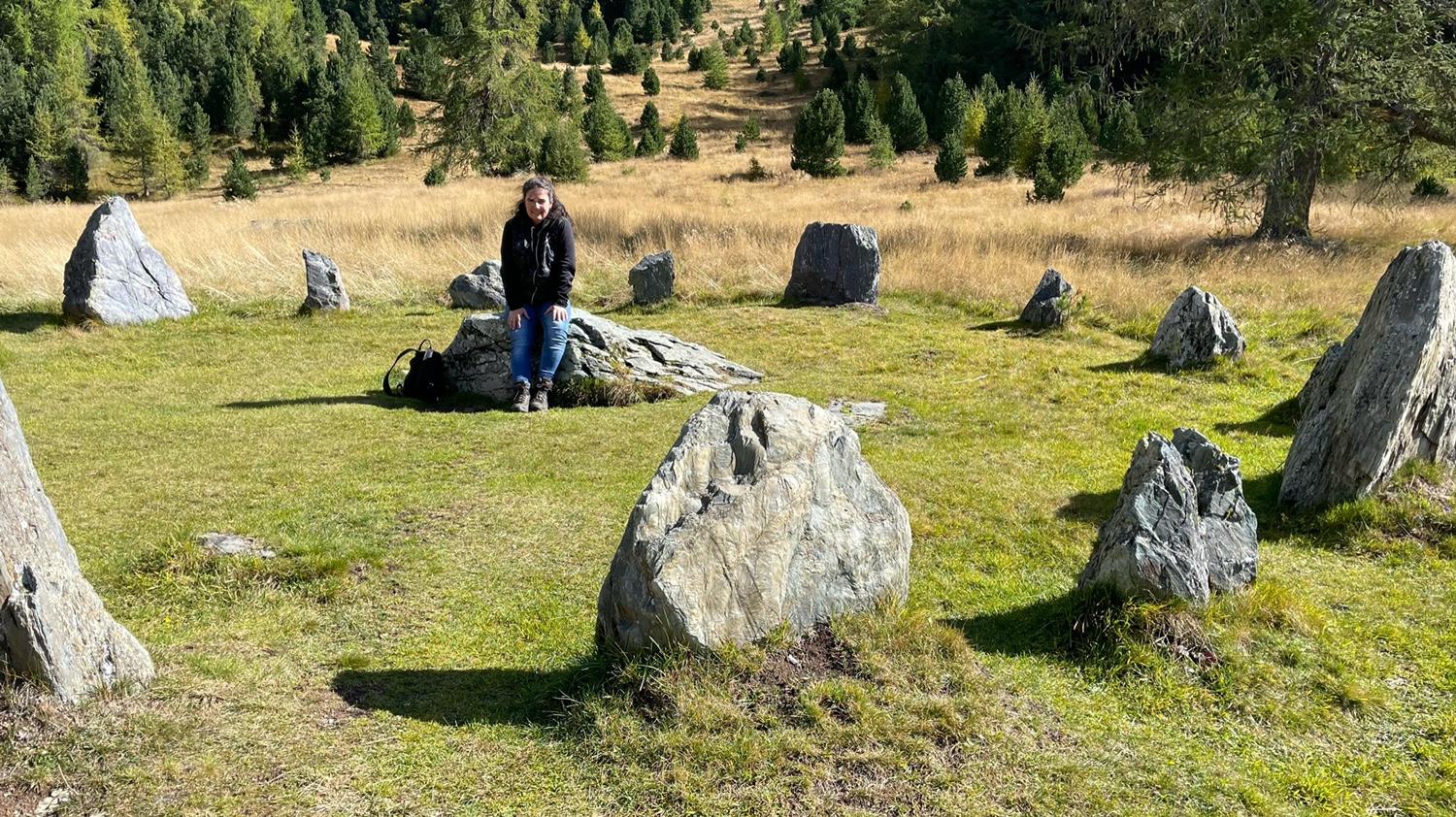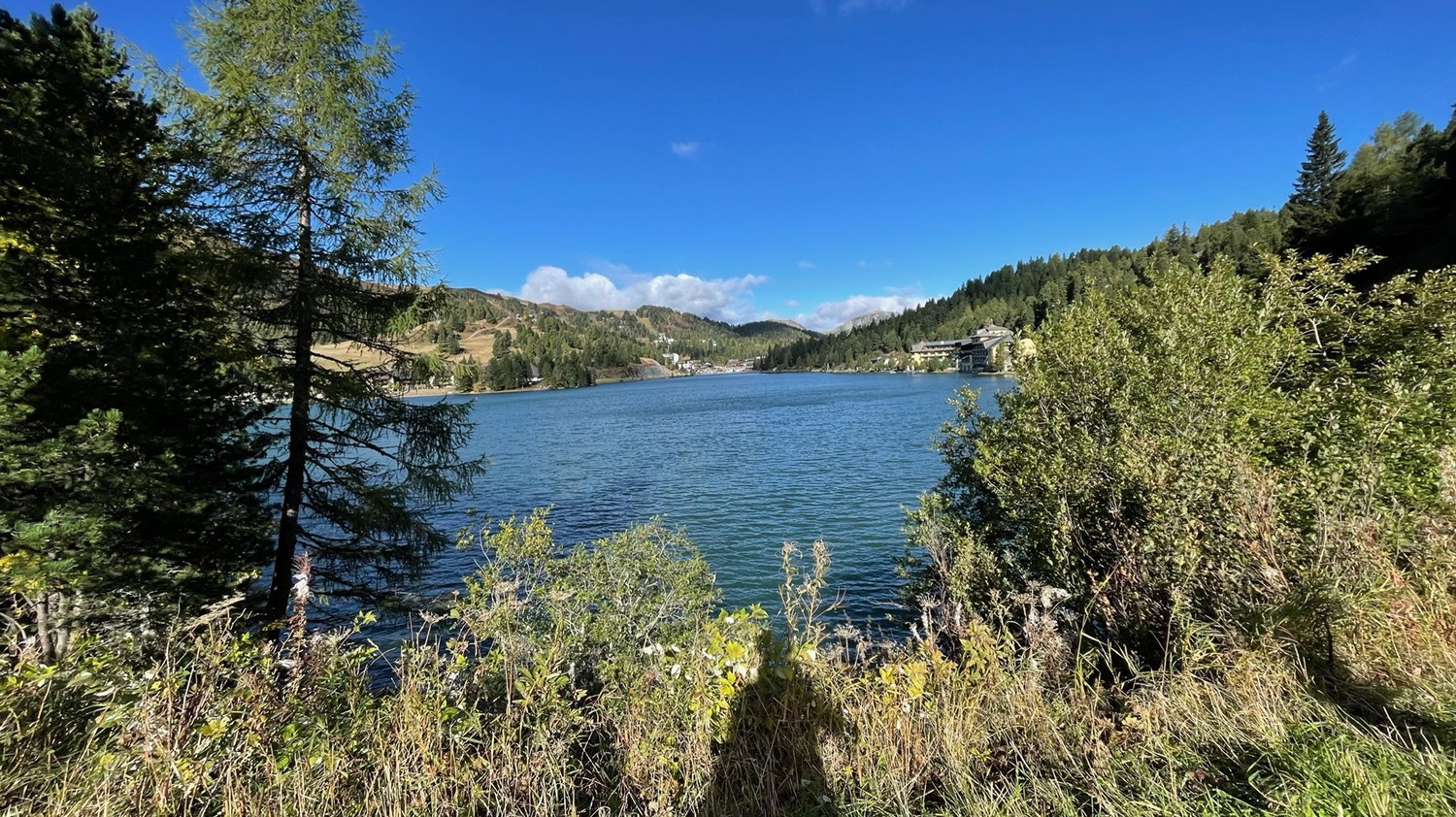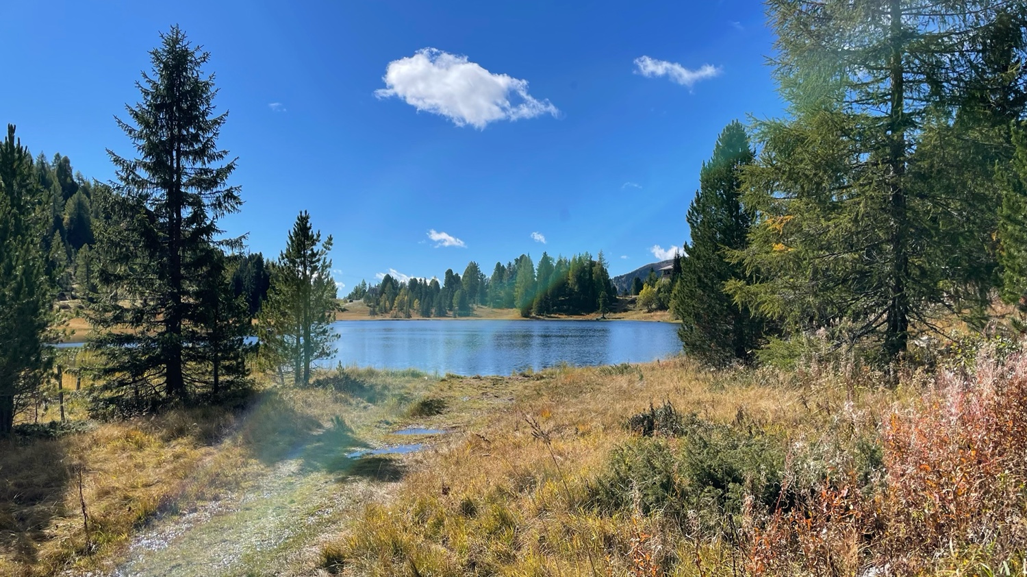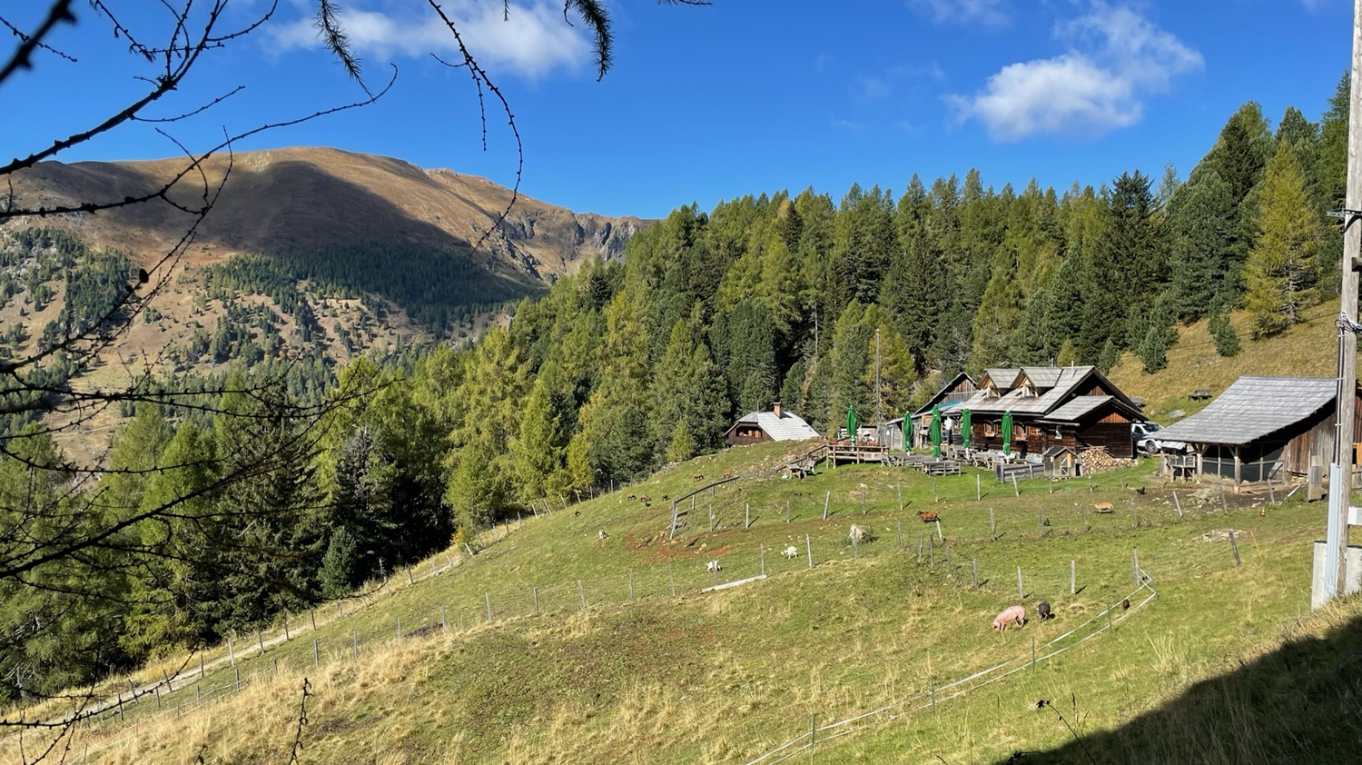 Weiter geht es am See entlang, vorbei an der „Karlhütte“. Wir haben eine sehr schöne Sicht, können bis zur Falkertalm gucken. Die Sonne scheint, aber im Schatten ist es kühl. Perfektes Herbstwetter. Wir wandern durch den Wald und über Wiesen weiter zur „Sonnenalm.“.