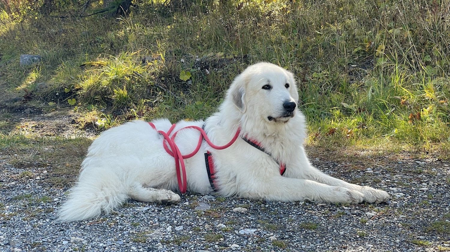 Die Bella hat wieder wunderschön geschlummert. Nur ganz abends mußte ich mal schimpfen, weiiil, da habe ich draußen was gehört. Und ich muß meine Herde beschützen. Das ist meine Aufgabe. Ich bin eine Herdenschutzhündin!
