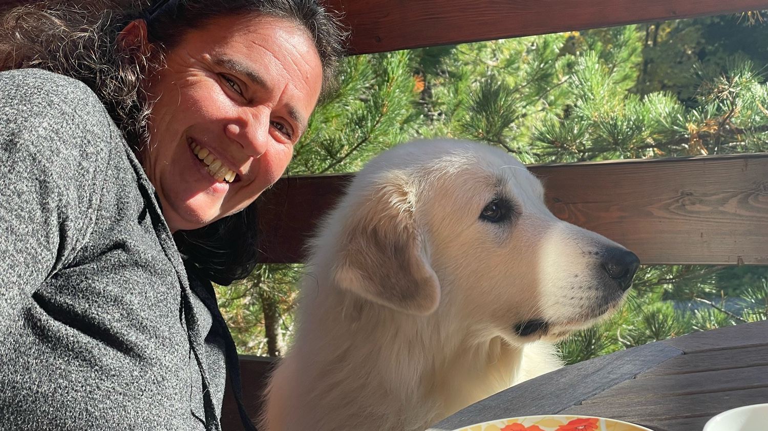 Dann geht es zurück zum Ferienhaus. Kaffee gibt es heute auf unserer kleinen Terrasse. Da scheint nachmittags so schön die Sonne hin. Bella ist erstmal KO. Beim Kaffeetrinken besucht uns ein Eichhörnchen. Sitzt im Baum, direkt neben der Terrasse und beobachtet uns.