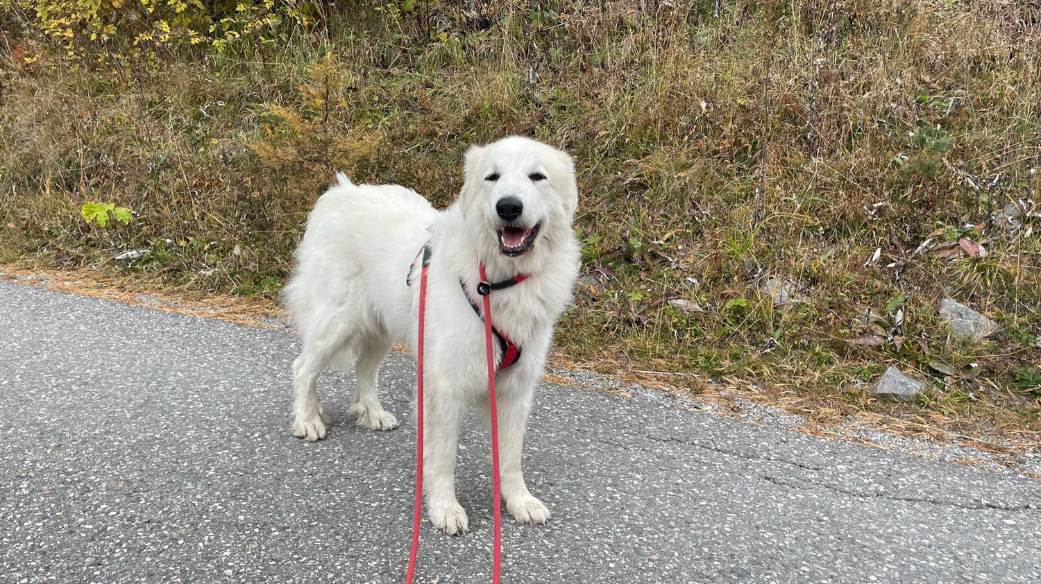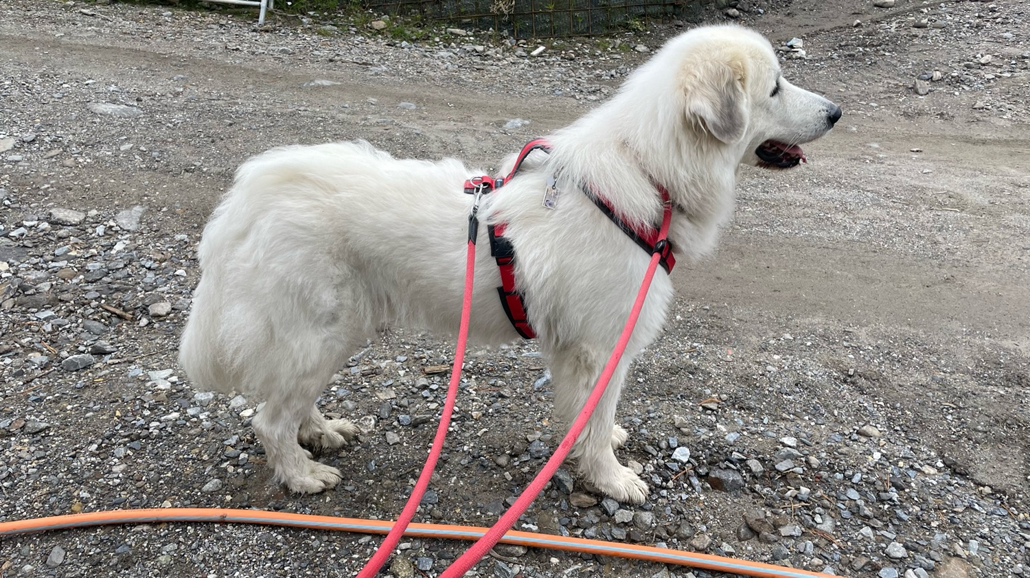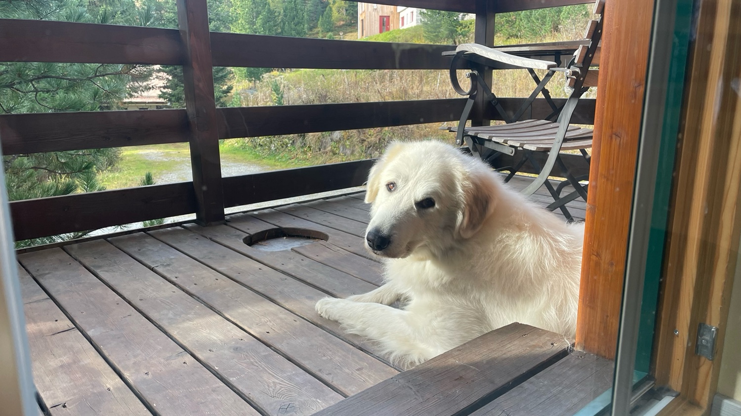 Dann ging es wieder den Berg hoch. Das kann ich gut. Klettern. Ich bin eine Berghündin. Eine Pyrenäenberghündin! Ich kann klettern. Berge sind schön. Da kann ich ganz viel schnuffeln, klettern und gucken. Wir sind dann wieder über die große Straße und zurück zu unserem Ferienhaus gelaufen und da ist uns von ganz oben vom Berg eine riesengroße graue Wolke entgegengekommen.