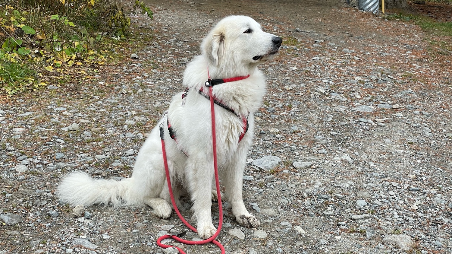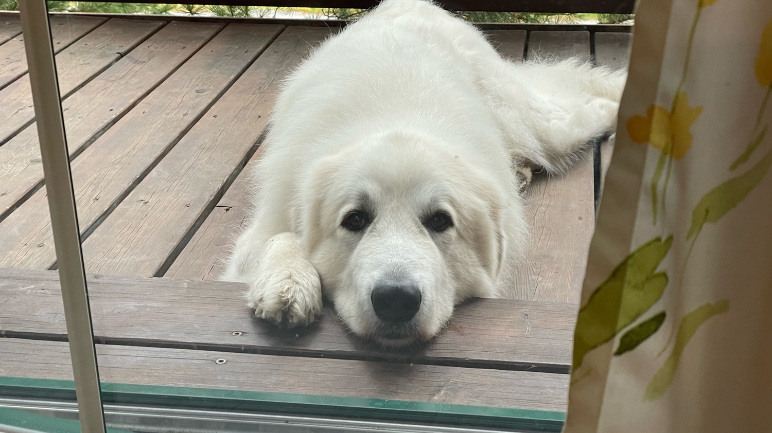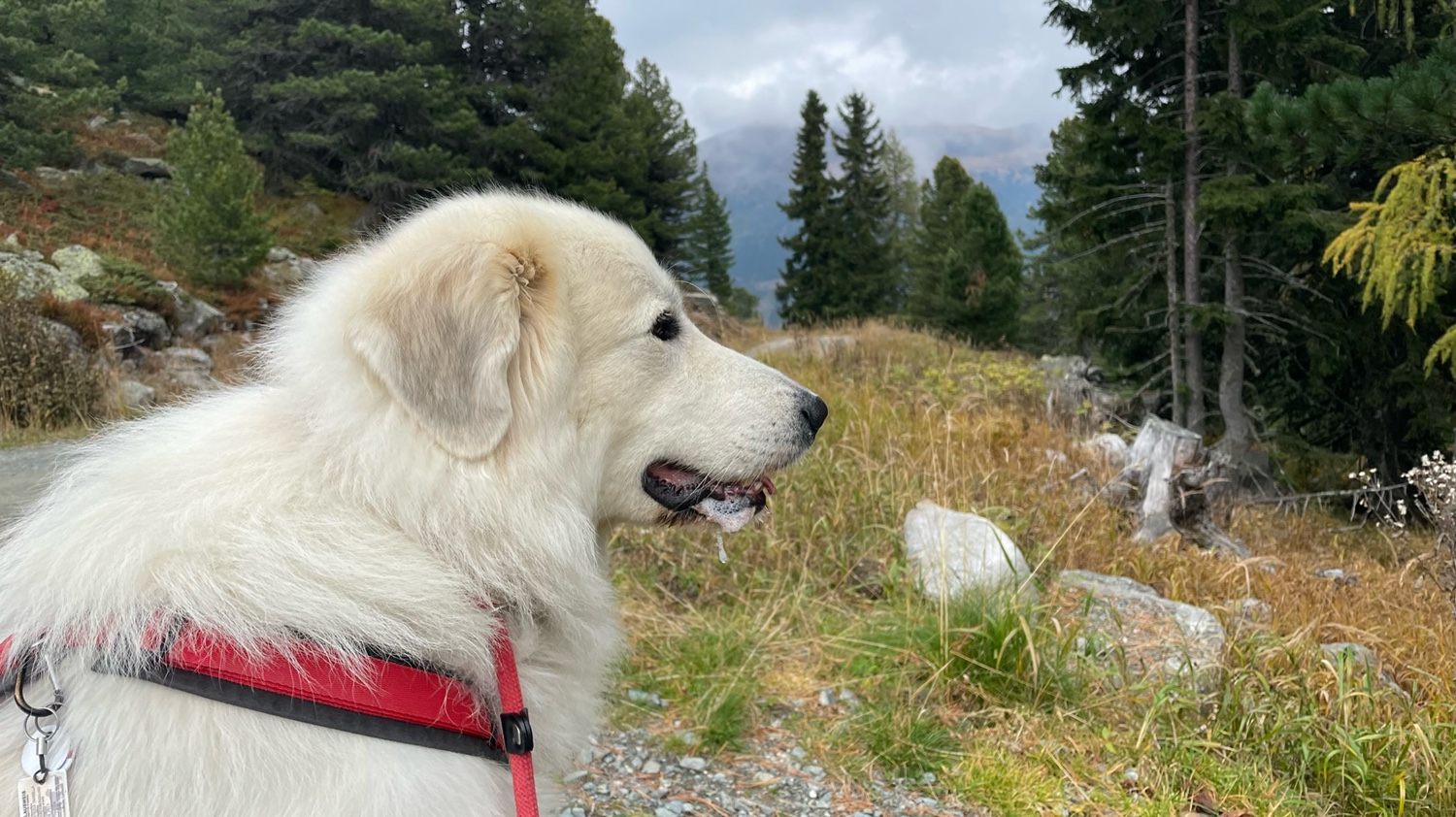 Dann ging es wieder den Berg hoch. Das kann ich gut. Klettern. Ich bin eine Berghündin. Eine Pyrenäenberghündin! Ich kann klettern. Berge sind schön. Da kann ich ganz viel schnuffeln, klettern und gucken. Wir sind dann wieder über die große Straße und zurück zu unserem Ferienhaus gelaufen und da ist uns von ganz oben vom Berg eine riesengroße graue Wolke entgegengekommen.