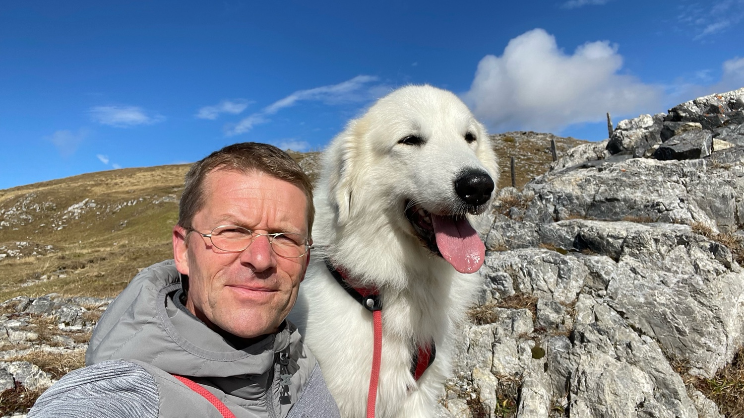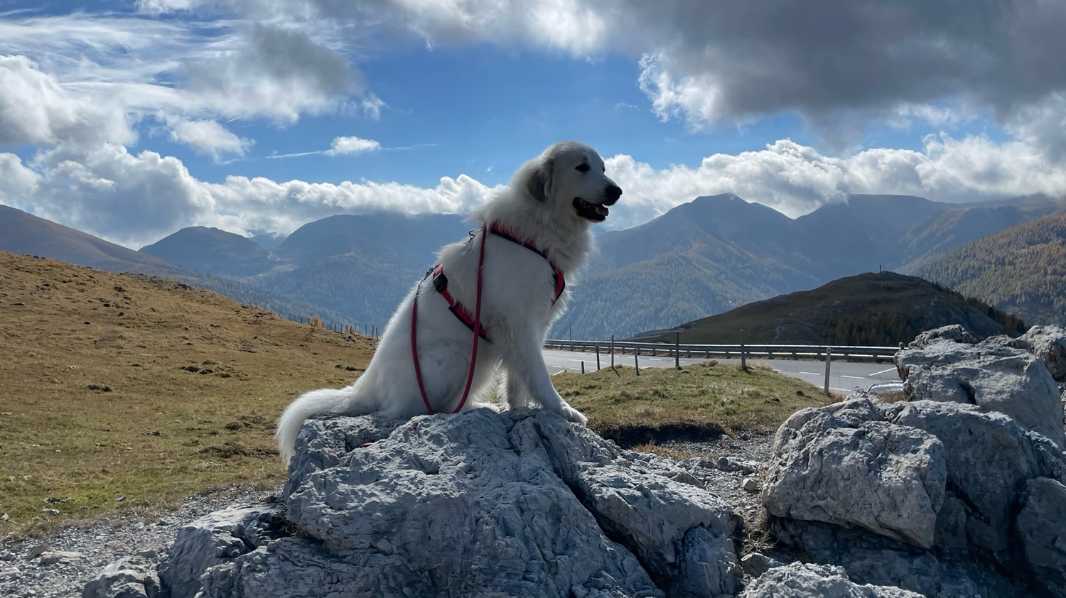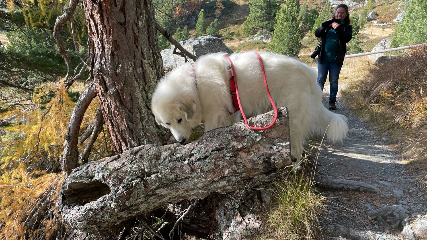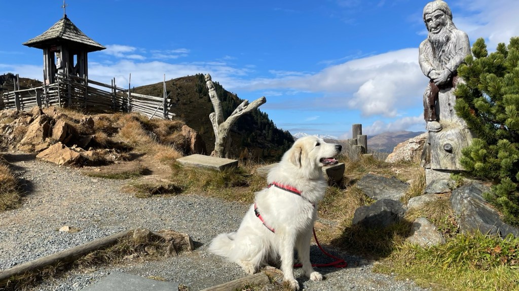 Wir sind dann wieder ein langes Stück gefahren und dann haben wir nochmal eine Pause gemacht. Und da sind wir dann schön gewandert. Den Hügel hoch. 25 Minuten bis ganz oben stand da auf einem Schild, sagen meine Menschen. Aber die Bella sagt, das schafft man auch in 15 Minuten. Und die Bella ist eine Berghündin. Eine Pyrenäenberghündin! Ich bin sehr willensstark.