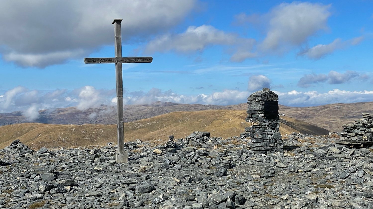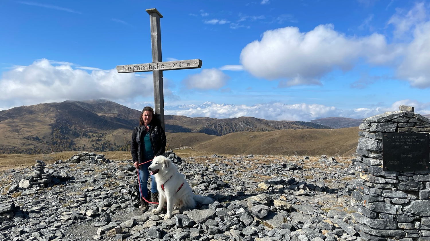 Den nächsten Stop legen wir am höchsten Punkt der Nockalmstraße, der 2.042 m hoch gelegenen Paßhöhe Eisentalhöhe, ein. Von der Paßhöhe führt ein schöner Weg auf 2.180 m zum Gipfel der Eisentalhöhe. Die Gehzeit ist mit ca. 25 Minuten angegeben. Unsere Berghündin ist aber der Meinung, das kann man auch in 15 Minuten schaffen. Nach 12 Minuten legen wir, kurz vor dem Gipfel, eine kleine Pause ein, genießen die Aussicht und sind trotz Pause nach knapp 15 Minuten tatsächlich am Gipfelkreuz.