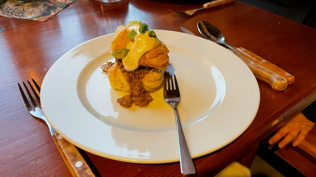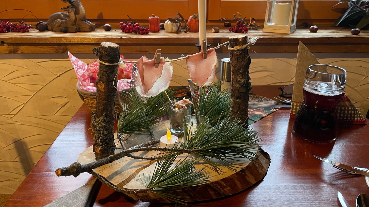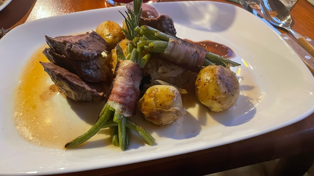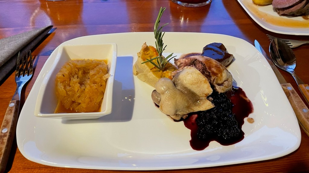 Zum Abendessen fahren wir nochmal runter an den See. Dort stellen wir das Auto ab und wandern den Berg hoch zum „s‘Hüttenplatzerl“. Da haben wir uns zum Essen für den heutigen Wildabend angemeldet. Wir entscheiden uns für Hirschsteak und Gefüllte Wachtel. Beides super lecker.